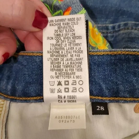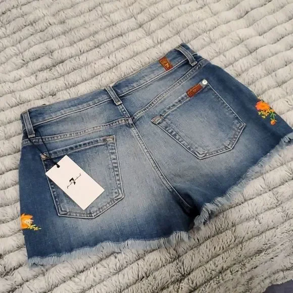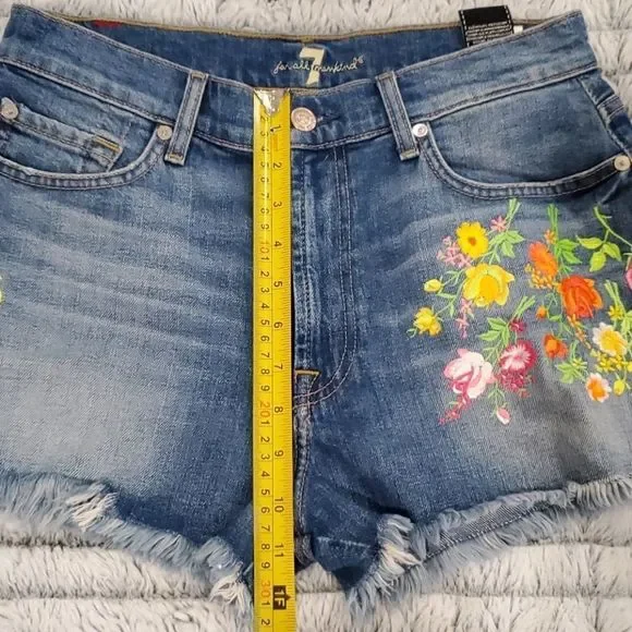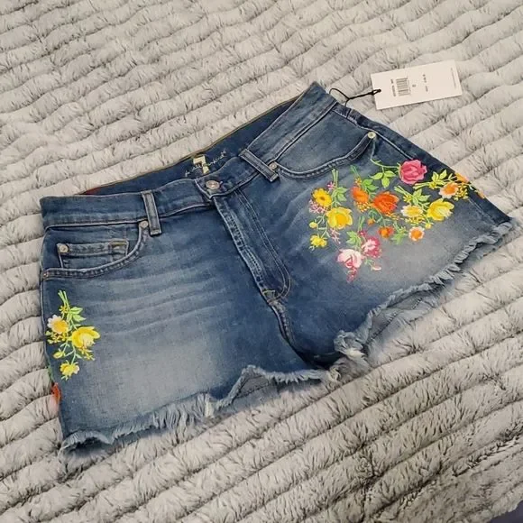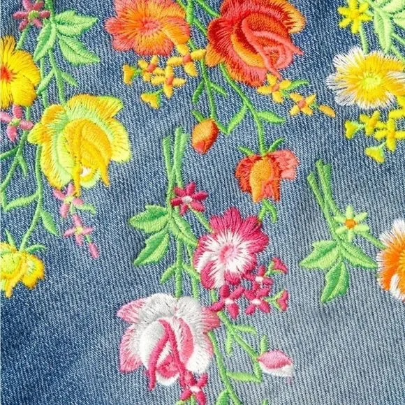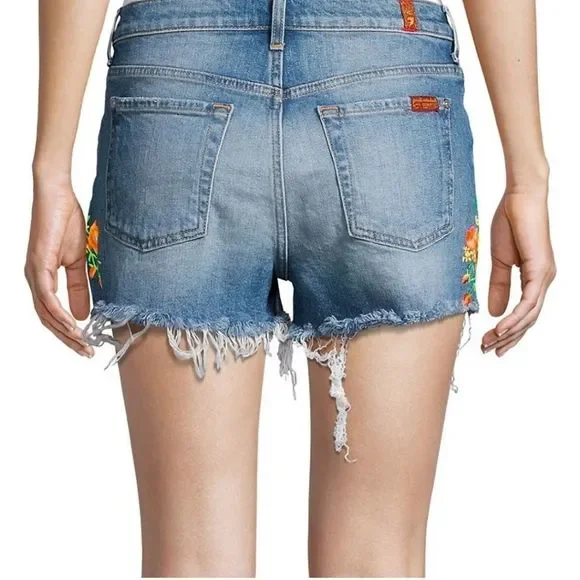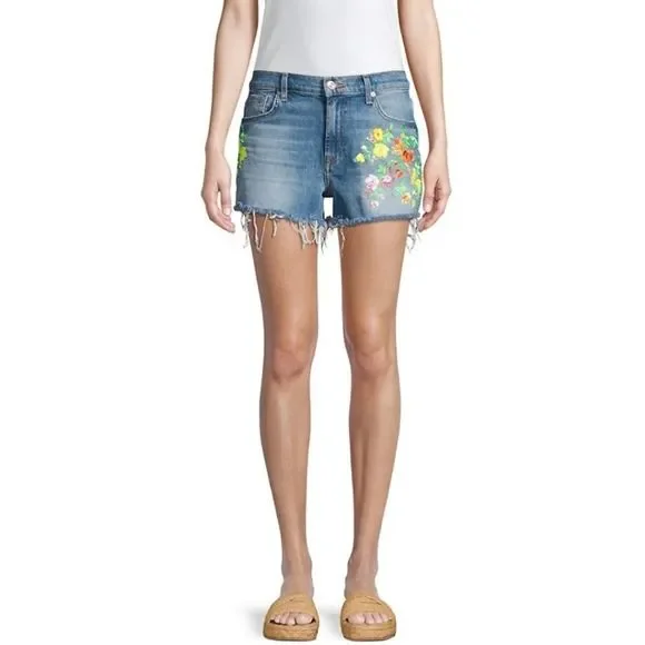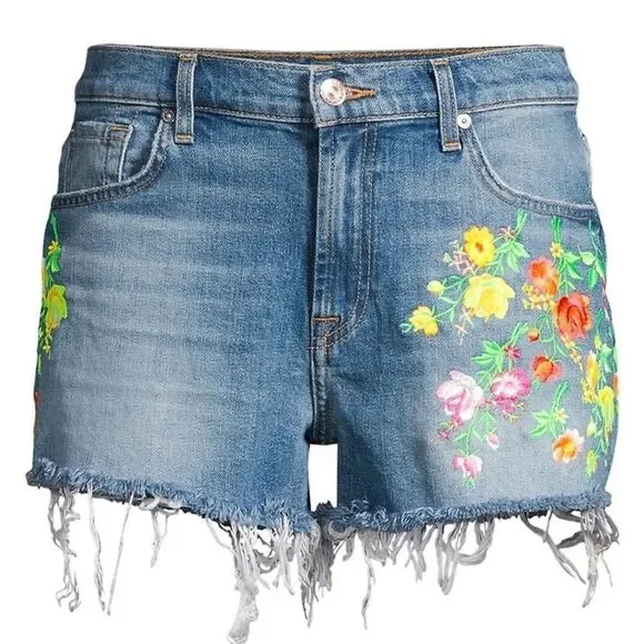 Embroidered flowers are a pretty addition to jean shorts with frayed hems.Belt loopsZip fly with button closureFive-pocket styleFrayed hemsCotton/elastaneMachine washImportedSIZE & FITRise, about 10"Inseam, about 3"Leg opening, about 23"Model shown is 5’10” (177cm) wearing US size 4Please note: Unique distressing/frayed hem may vary.
