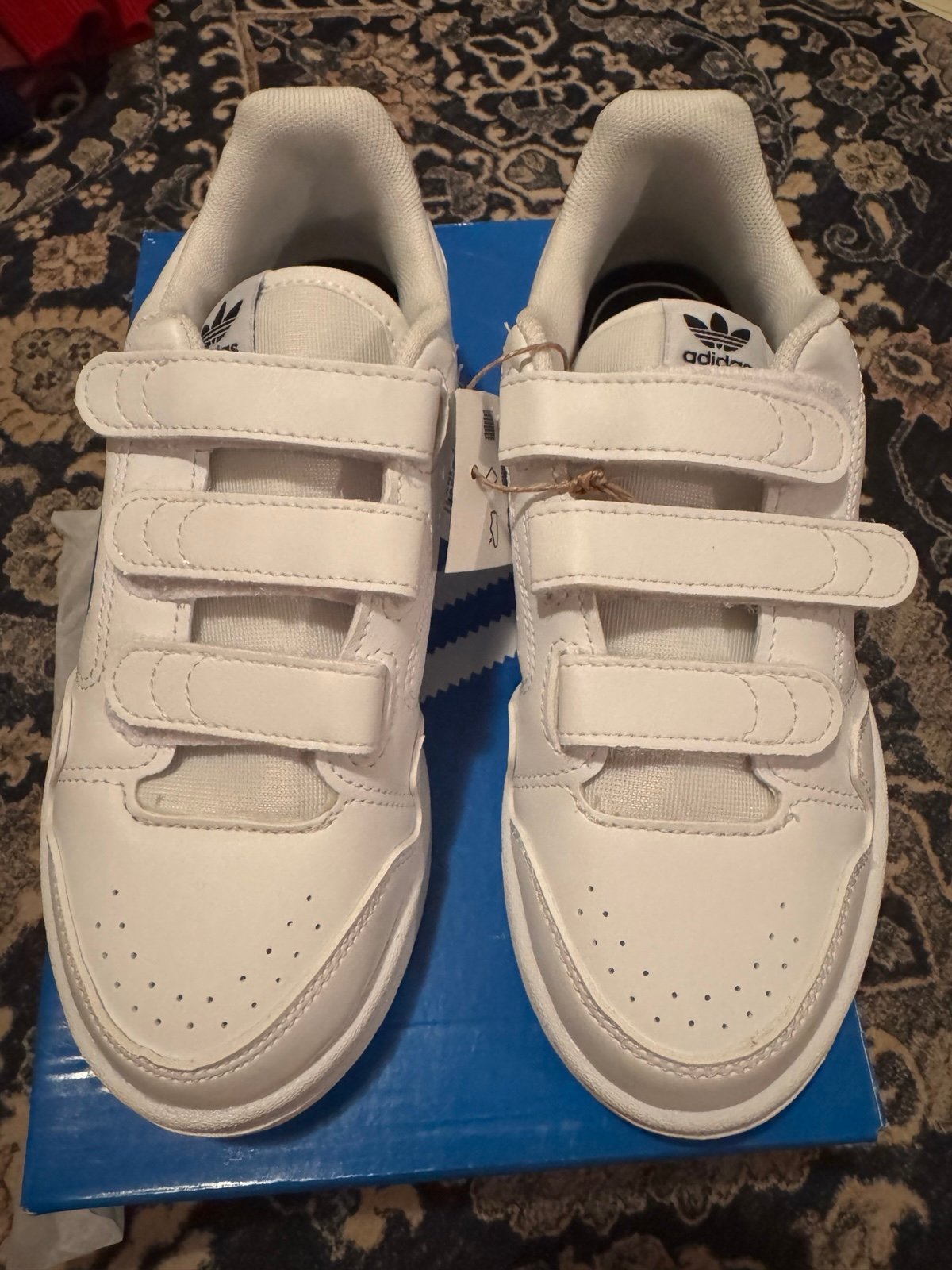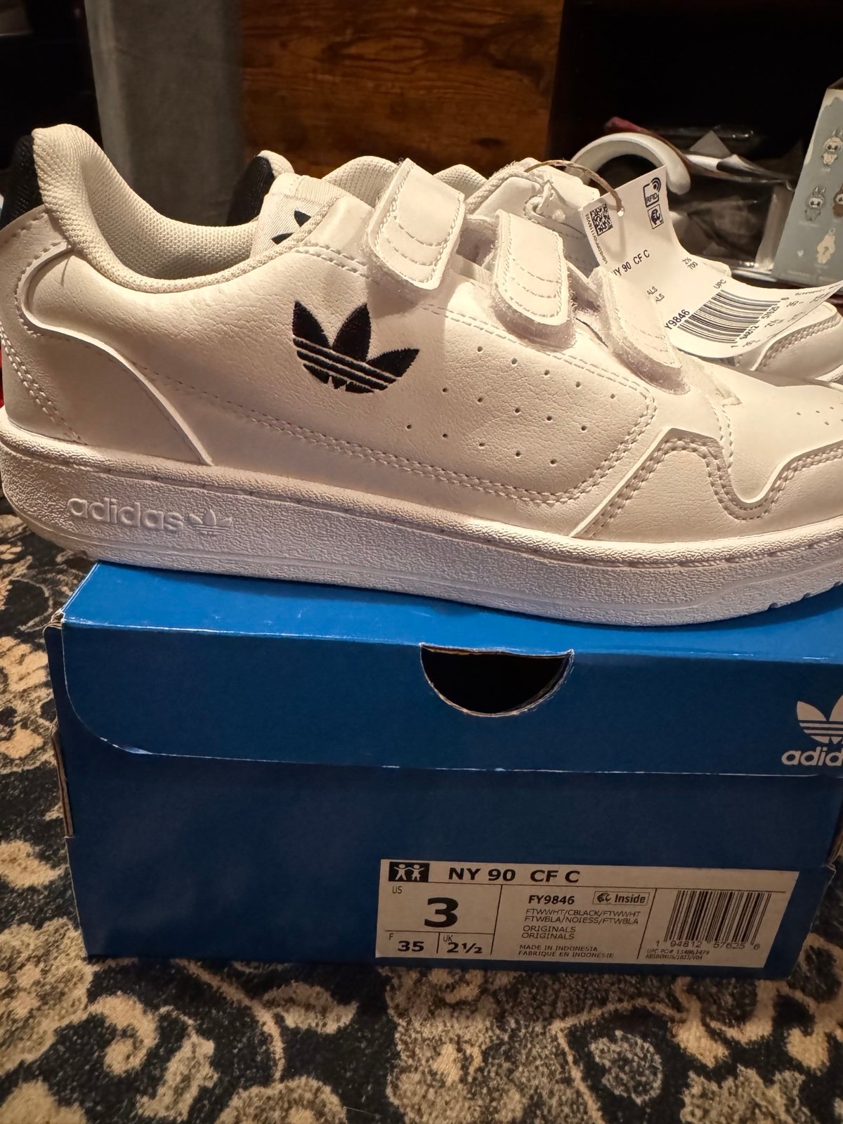 The Adidas NY 90 CFC Youth 3 tennis shoes in white are a stylish and comfortable option for young athletes. With a low top design, lace-up closure, and flat heel height, these shoes are perfect for playing tennis. The round toe shape and rubber outsole provide durability and support for active kids. The iconic adidas logo accents add a touch of sporty flair, making these sneakers a great choice for summer, fall, or spring seasons. Brand new in the box, these athletic shoes are sure to be a hit with both boys and girls.