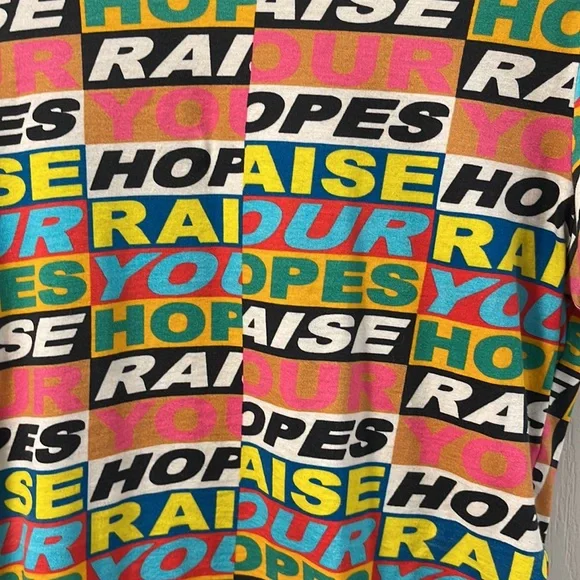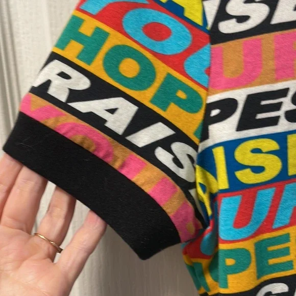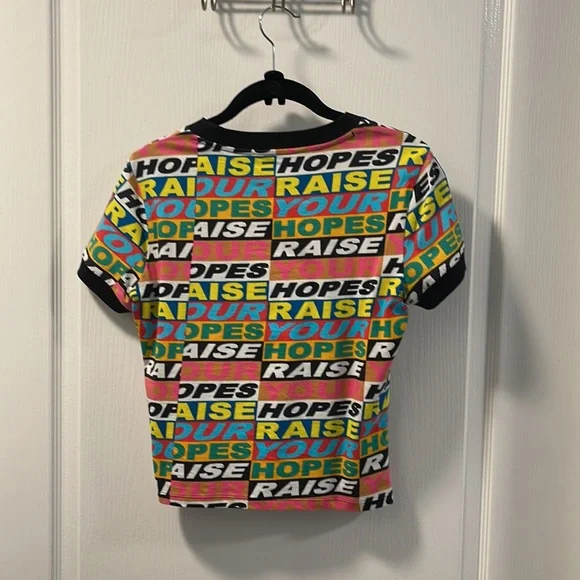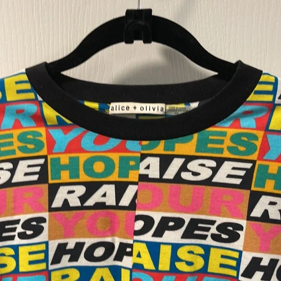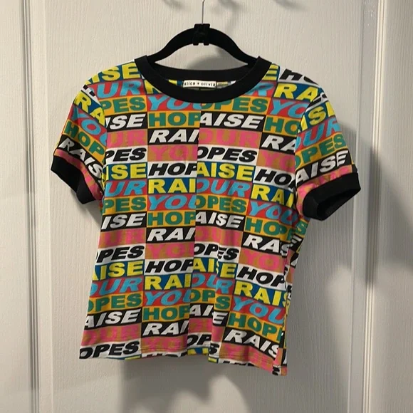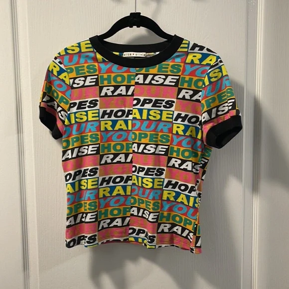 The “Raise Your Hopes” T-shirt by trendy and chic NYC cult brand Alice + Olivia. EUC. Beautiful colors throughout this graphic print. Features black ribbed crew neck and short sleeve openings. No visible flaws. Size Small. Fits like an XSmall. A terrific statement piece! Proud Posh Ambassador IIAll items from my smoke free home.All designer items are authentic. Fast shipper. Thank you for visiting my Closet! 🌸 Happy Poshing!