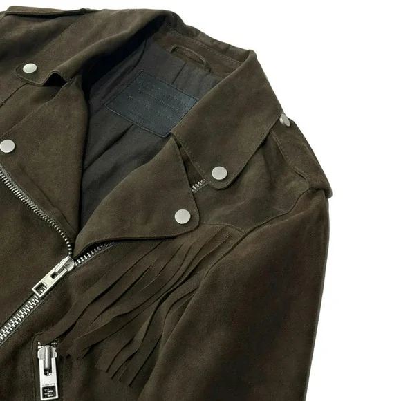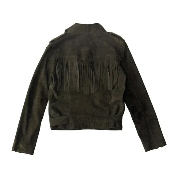 An absolutely stunning piece. Deep brown sueded leather jacket with the perfect cut, belted, and fringes throughout. Easily wear this with some jeans and elevate your everyday look. Shoulders: 15”Pits: 17”Length: 20.5”Sleeve: 22”FOLLOW US (IN BIO) ! CRAZY ITEMS DAILYDON’T OFFER IF YOU CANNOT PAY SAME DAYTHESE ARE PICTURES OF THE ACTUAL ITEM.NO REFUNDS , BUY WITH CONFIDENCE, ALL ITEMS AUTHENTIC(check feedback)WE ARE NOT RESPONSIBLE FOR PACKAGES AFTER IT IS HANDED TO THE CARRIER.