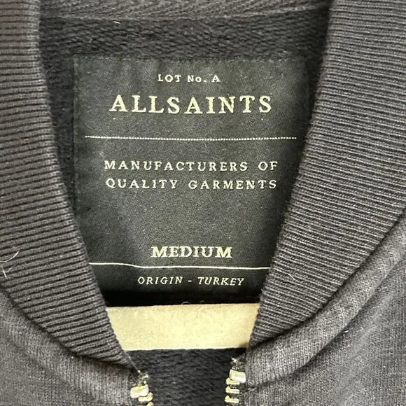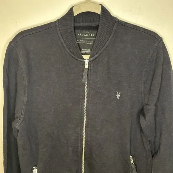 This is an ALLSAINTS Oldsen Bomber Jacket in black cotton, designed for men in size M. It features a crew neckline, full zip style, long sleeves, and tight-knit fabric with stretch for comfort. The jacket includes zipper accents and the brand's logo. Suitable for both party occasions and casual wear in the fall and spring seasons. Easy to care for with machine washable instructions.