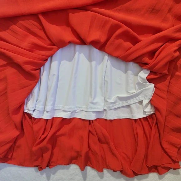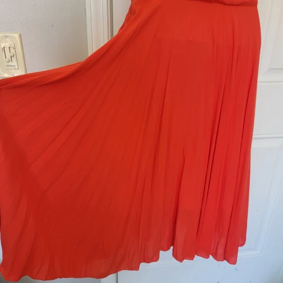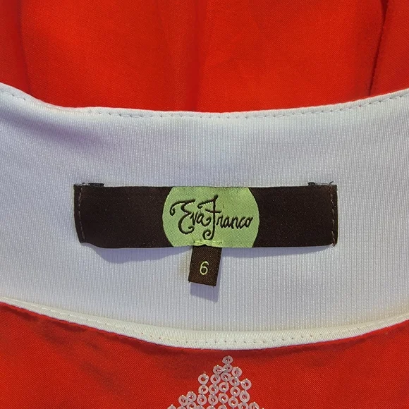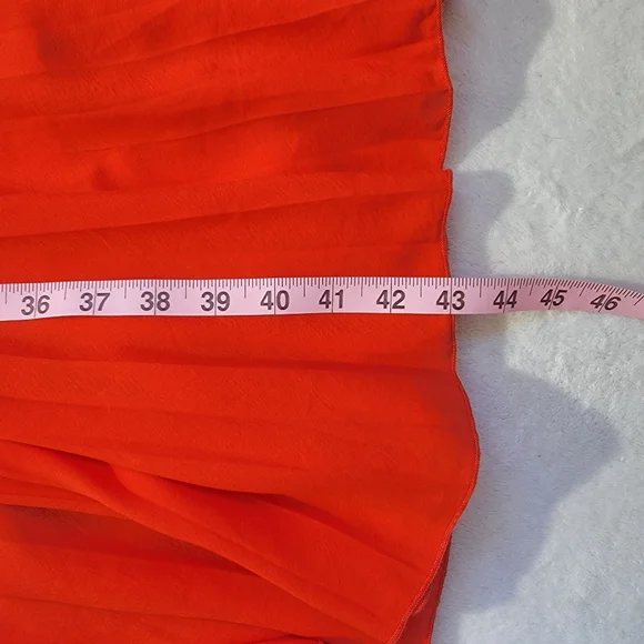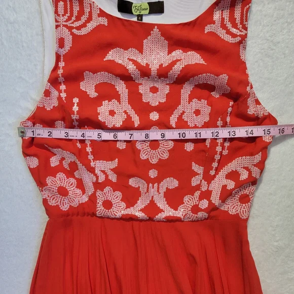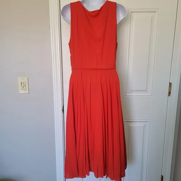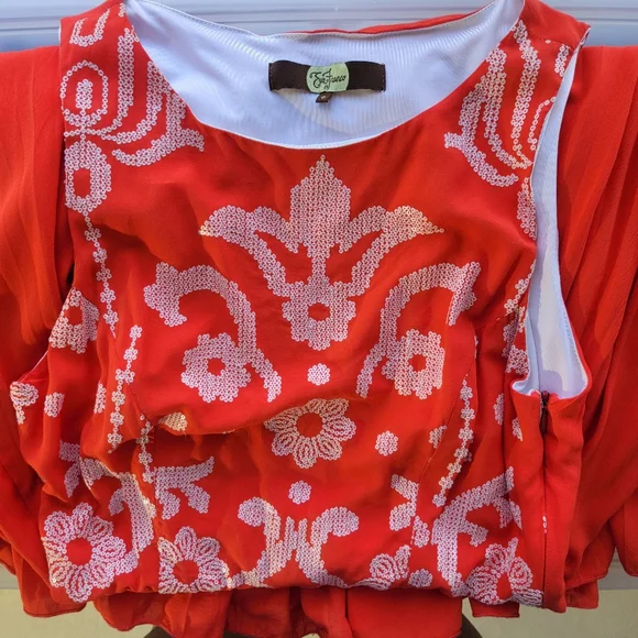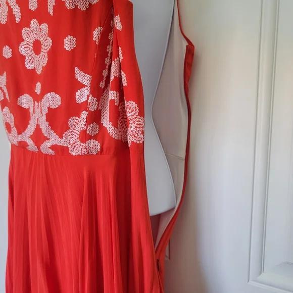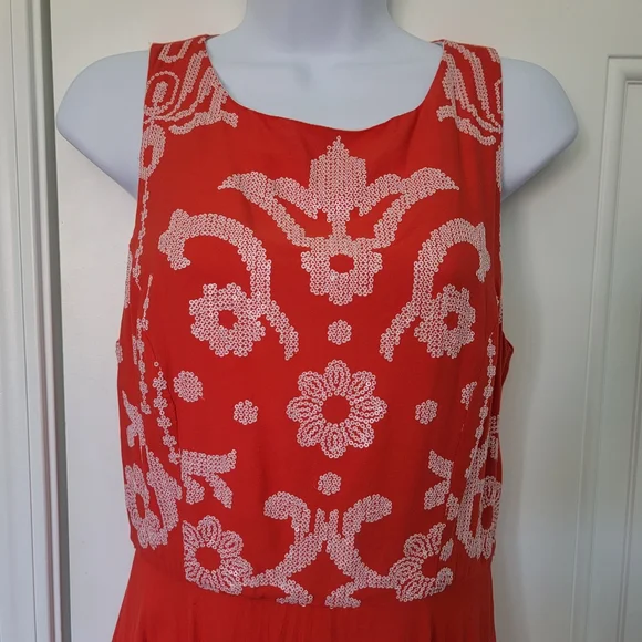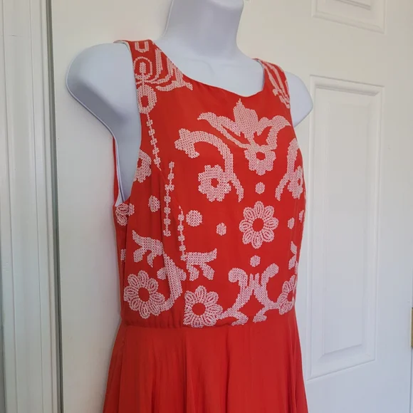Gorgeous flowy dress by Eva Franco an Anthropologie brand The color of this dress is a vibrant Orange/ red. Beaded TopSleeveless Side zipSize 6Excellent pre-owned condition