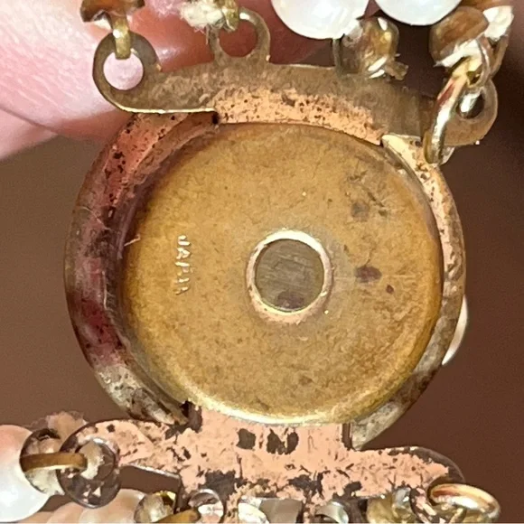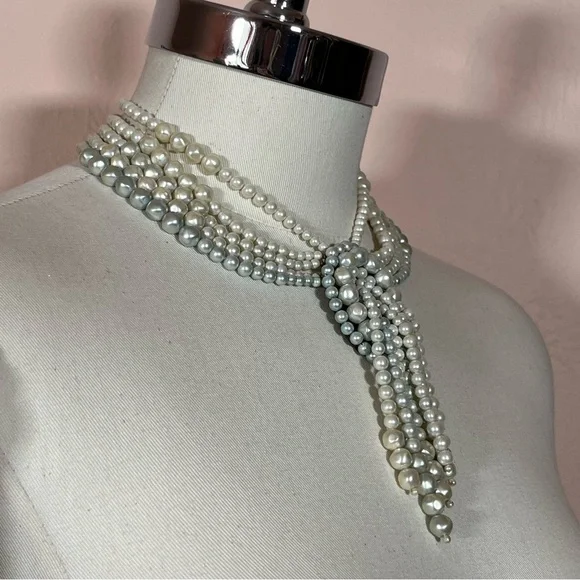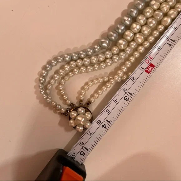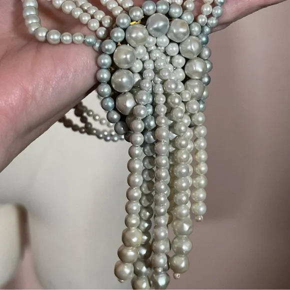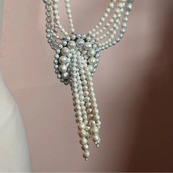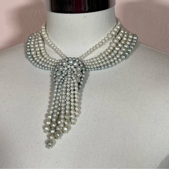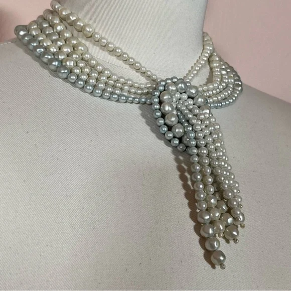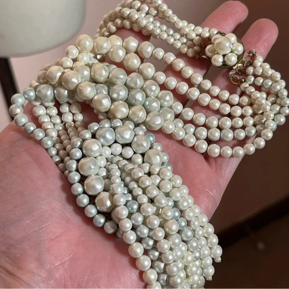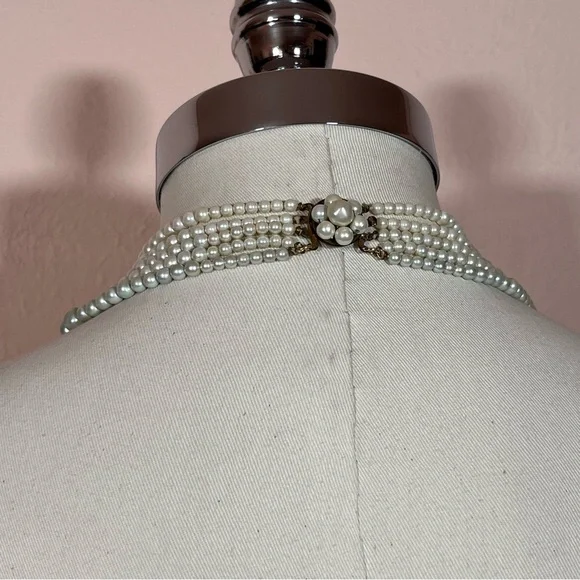 Antique Vintage Maximalism Waterfall Pearl Victorian Choker festoon NecklaceBeautiful Victorian revival festoon choker necklace. Made with five rows of glass pearls in shades of pure white to pale blue gray.Lovely waterfall design that hangs down in a gathering of pearls with a graduating pearl design. Made to look like natural baroque pearls some larger bumpy ones blend to smooth smaller ones. Decorative flower sits on top of a tongue and groove clasp stamped Japan. Excellent vintage condion with no known flaws Size approximately 14 1/2 wearable inchesNeed more specifics? Just ask.❤️ I am happy to help.Offers welcome ❤️