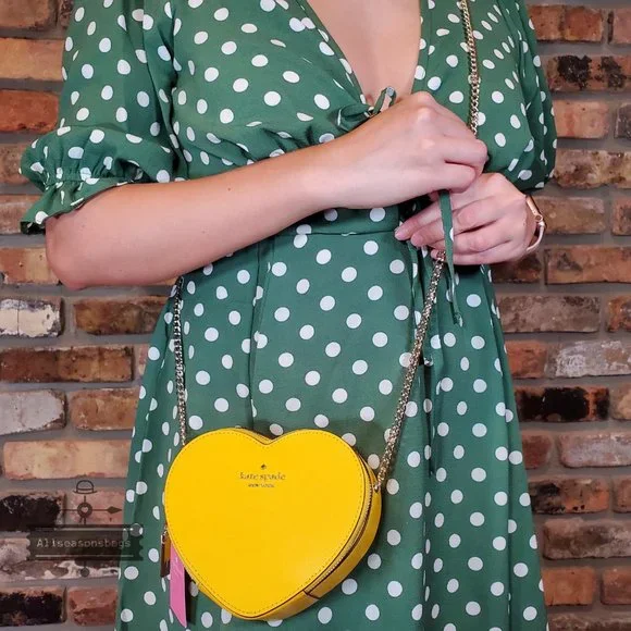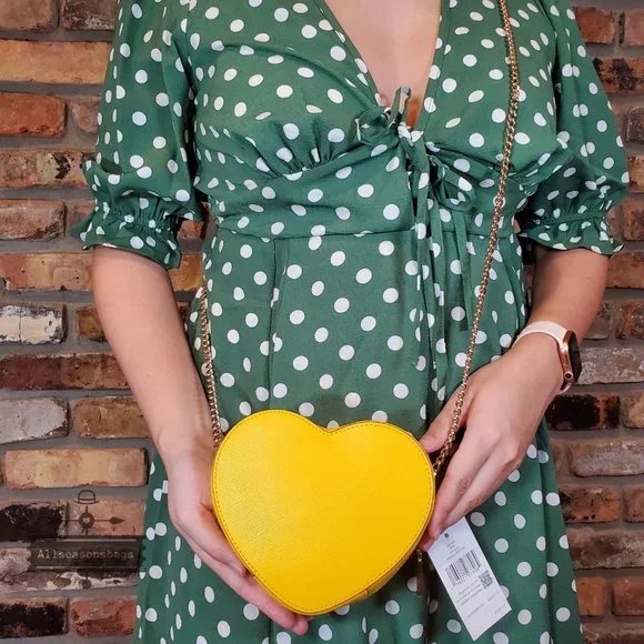 ** Authentic Kate spade Love Shack Mini Heart Chain Crossbody Bag Purse Yellow NWT*** CLOSET CLEAR OUT!!! LAST PRICE - no more reductions, FIRM PRICE ***Model wears size XS so items may appear larger in photos. PLEASE check all MEASUREMENTS before making a purchase to ensure this is the exact size that you’re looking for.** New with tag bag, purse, trendy5.1" h x 5.9" w x 2"d ( super small bag! check measurements please)Strap drop: 23"Saffiano leatherKsny metal pinmount logoTwo way spade jacquard liningZip closureno dust bagPlease be aware that every bag is unique and the pattern you receive may differ from the pattern in the photos!