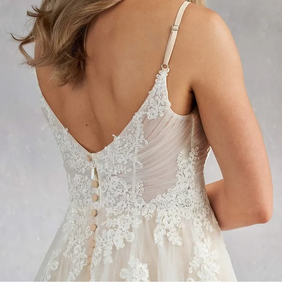 New with tag and original packaging with is a carry bag for storage and protection!Official site verbiage: This gown was designed with extra length to keep the varying heights and shoe choices of each individual in mind. It can be easily altered to create the perfect fit.Color : Diamond White/ChampagneLength : Chapel TrainFabric : Tulle, LaceSilhouette : A-LineStraps & sleeves : Spaghetti StrapsNeckline : V-NeckBack style : V back, Button, Back ZipEmbellishment : Lace, Beaded, SequinsPadding : YesBoning : YesStyle : Elegant, Romantic, Princess