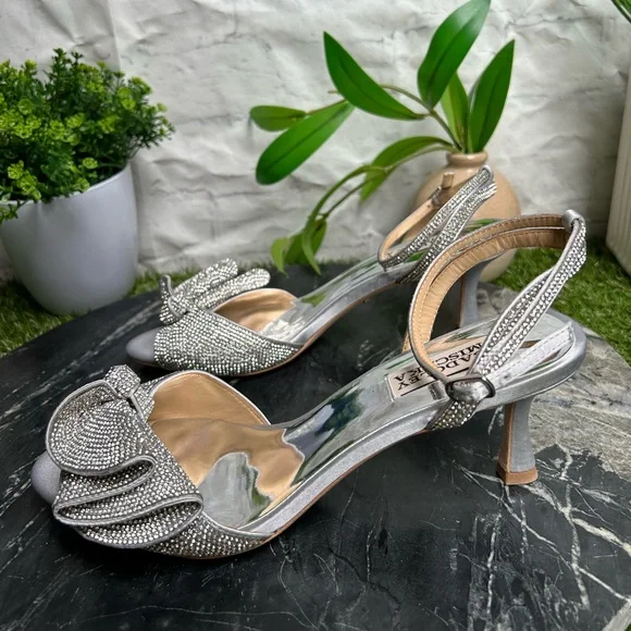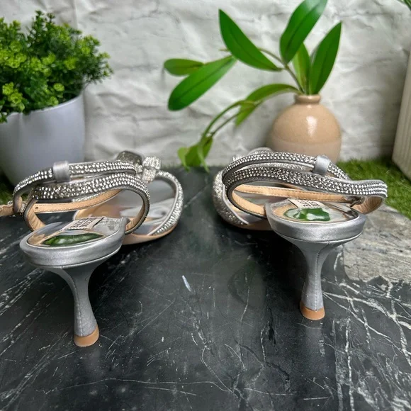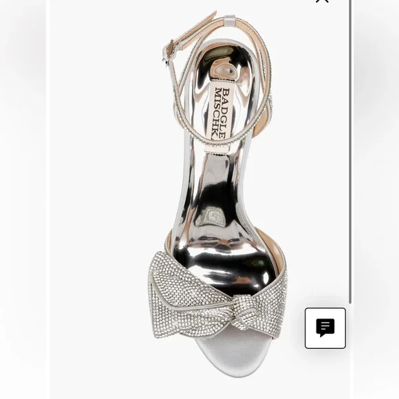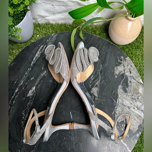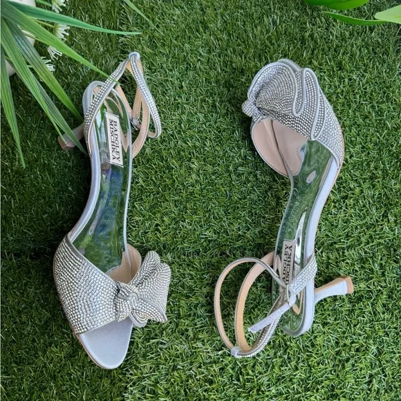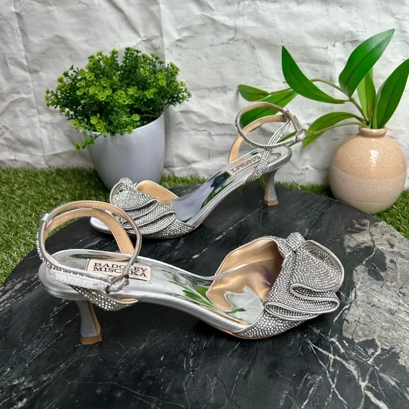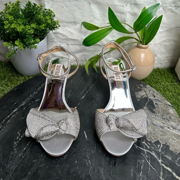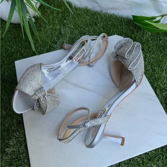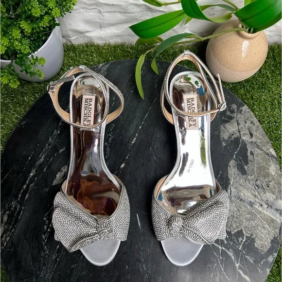 Remi Sandal (Women) size 9 Badgley Mischka Collection Color: Silver Satin$235.00 Ankle Strap Sandals women Gently used Perfect for a wedding, prom, wedding guest, formal, casual party or any formal occasion Very comfortable Retail $235Details & careGet luxe shine from heel to toe in this strappy sandal set on a foam footbed, detailed with glittering crystals and topped by an asymmetricbow.• 21/4" heel• 21/2" strap height• Adjustable ankle strap with buckle closure• Memory foam cushioning• Textile upper/synthetic and textile lining/leather sole• ImportedTags# Tory Burch, Kate spade, Ted Baker, Adrianna Papell dress, eliza j, Gal meets Glam, Dress