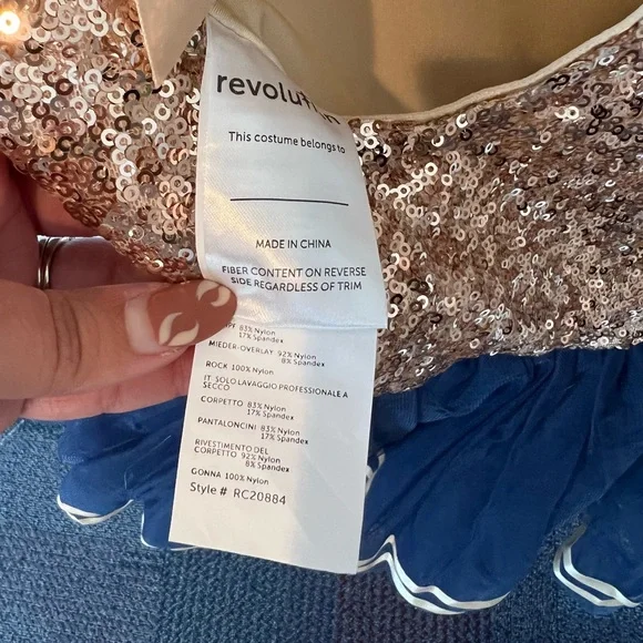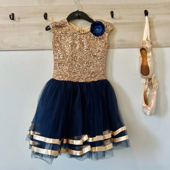 Captive Heart from Revolution DancewearSpandex leotard with sequin mesh overlay has a keyhole back with hook closure and satin bow accent, as well as attached rhinestone flower accent at the shoulder. Skirt is layers of tulle with the top layer edged in satin ribbon.Hair accessory not included. Smoke free home. Excellent condition. New to ? Use code: ACHANCETODANCE for $10 off!