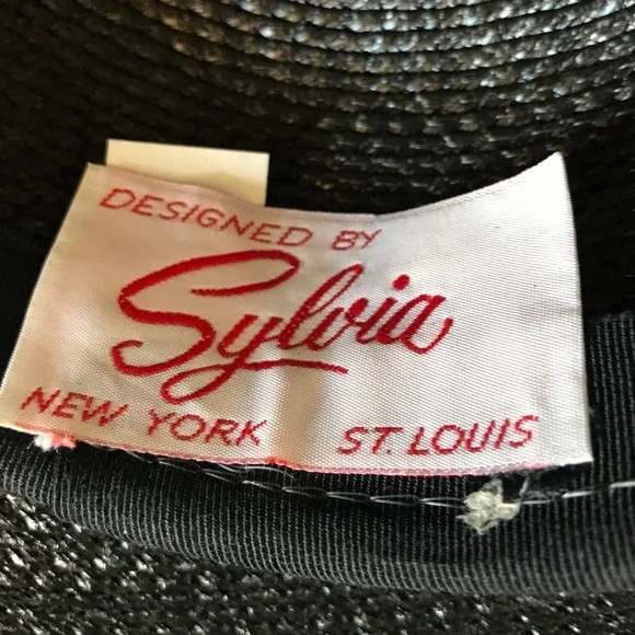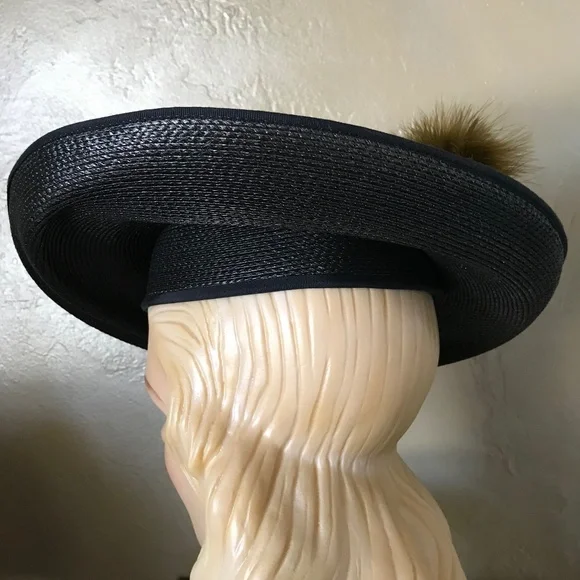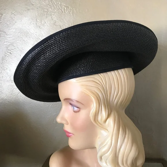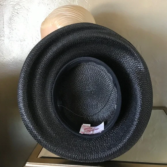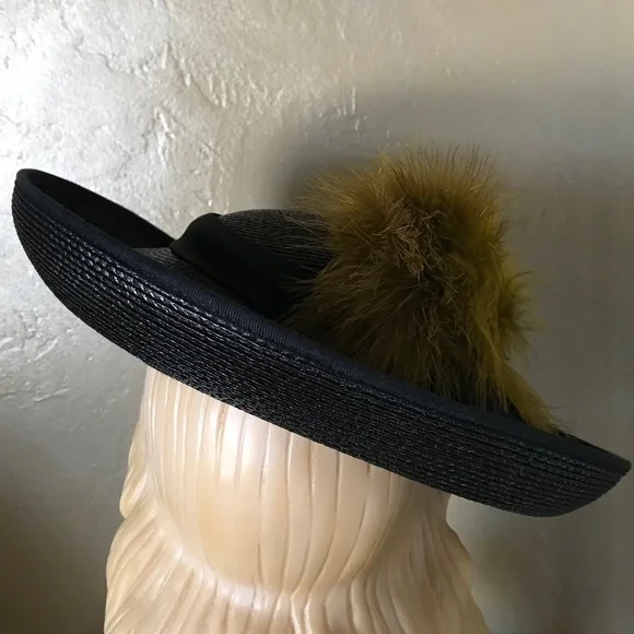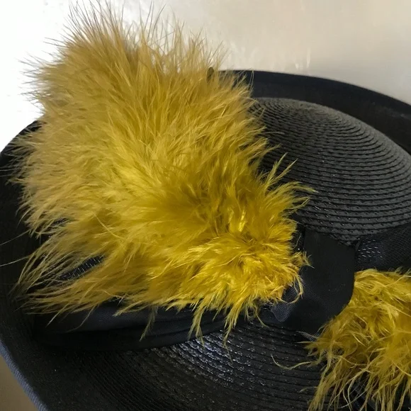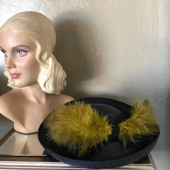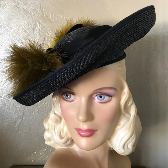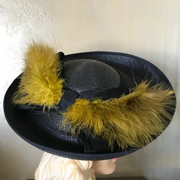 This is a most fashionable vintage black straw wide brim hat which consists of a round crown surrounded by an upturned, semi folded and slanted brim, so part of the crown shows at one side. The brim is edged in fabric. The crown is surrounded by a black fabric band, which ends at one side in a large double bow made of fabric and crin (Crin, also known as crinoline or horsehair, is a net-like material, easy to mold and is often used in the decoration of clothing, hats and accessories). From these bows there are two beautiful mustard colored marabou feather puffs. A rem arable look.Label: Designed by SYLVIA New York St. LouisThis hat is in wonderful vintage condition and has been lovingly preserved among over 1300 vintage hats we have collected for 40+ years. Feathers are fragile, given their age. Mannequin not for sale.