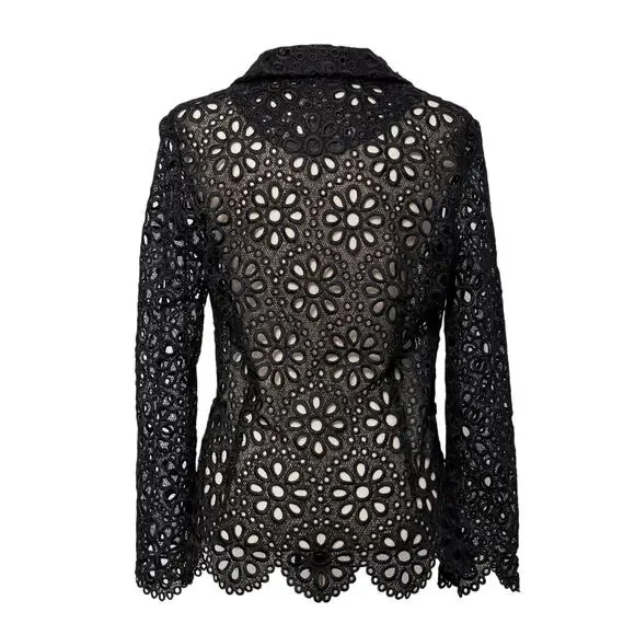 Introducing the epitome of sophistication and elegance - our Scalloped Lace Long Sleeve Blazer. This blazer is a timeless piece that will never go out of fashion. Available in classic black and pristine white, it is the perfect addition to any wardrobe and suitable for any occasion.Crafted from premium quality fabric, this blazer feels as luxurious as it looks. The delicate scalloped lace detailing adds a touch of femininity and refinement to this classic piece, elevating it to a level of pure elegance. The long sleeves provide an extra layer of coverage, while the two buttons in the front create a sleek and streamlined silhouette.Whether you're dressing up for a special event or need a versatile piece for your daily wardrobe, this blazer is the perfect choice. Pair it with your favorite skirt or dress for a chic and sophisticated look, or dress it down with a pair of jeans or leggings for a more casual yet stylish vibe.With its timeless design and superior quality, this Scalloped Lace Long Sleeve Blazer is a must-have for any fashion-conscious woman. Channel your inner fashionista and add this piece to your collection today. Trust us, you won't regret it.