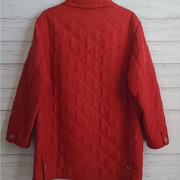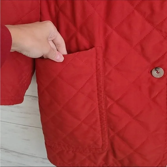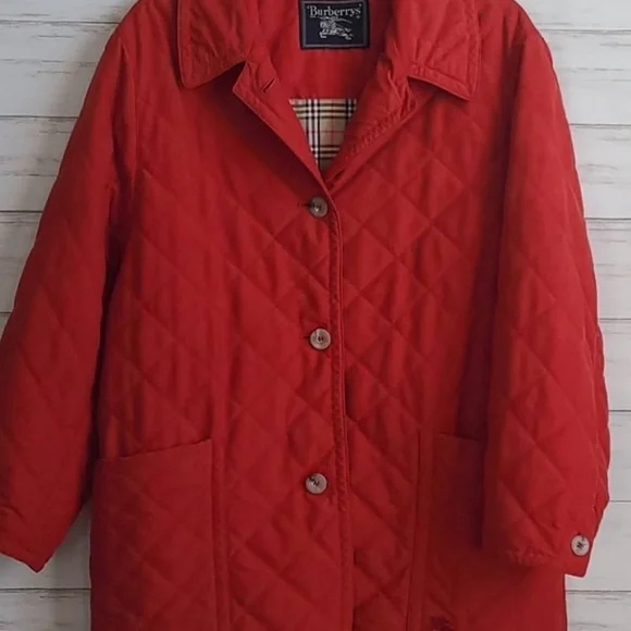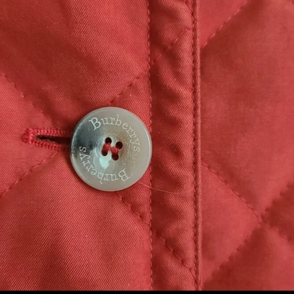 Vintage Burberry red quilted jacket. Exterior and interior pockets. Buttons on sleeves and back. Burberry logo on buttons and horse logo on pocket. Size tag removed but should fit L. Please check measurements and ask questions. Burberry was originally named Burberrys (with an “S”) until the late 90’s when they dropped the S, so this jacket is pre-1999.Chest 22"Length 30.5"Sleeve, cuffs unrolled 22" (this is a little shorter than standard, so it might fit more like 3/4 sleeve depending)
