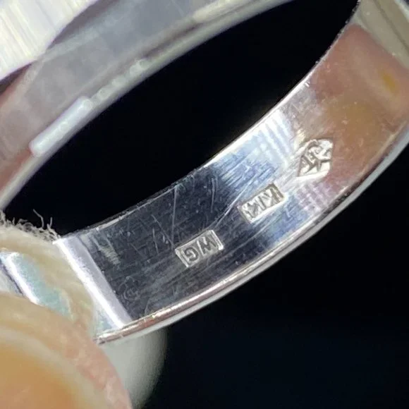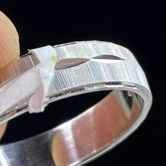 this is a truly classic mid-century wedding band for gentleman. It is a new old stock from 1950's (it still has original tag). The ring has very fine detail geometric etching, the ring is raise in the center line, it has bevel etching on top as well as on both margins, it is very elegant. 5.0mm wide, size 9, weight 3.9gm, hallmark 14KWG(1 inch = 25.4 mm; 1 dime = 17.9mm).All items are pre-owned unless otherwise stated. This means they have the usual aspects of pre-owned jewelry, such as light scratches, wear and tarnish. Please review all the photos which will be part of the description.