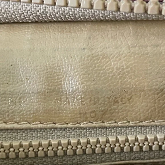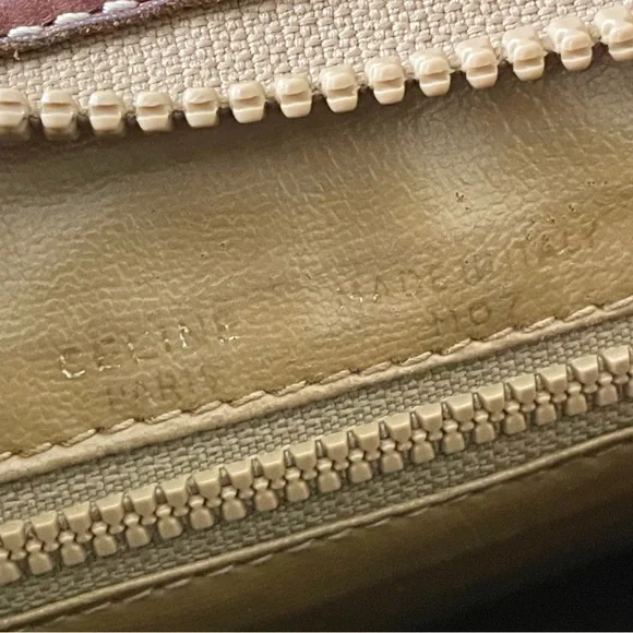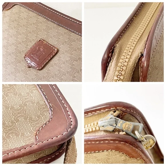Authentic CelineVintageSmall clutch bag9 x 6 x 2 inches Beige macadam monogram canvas with brown leather trimSignificant patina throughout the leather with some mending at the corners and on some of the trim, but overall it has aged really lovely. Some minor scuff marks Some wear on the stitching at the corner, this has been mended so it will not unravelCanvas is in good conditionSome fading to the gold hardwareRIRI zipper Interior is in good condition, one interior zip pocketSome fading to the interior label stamp, but it is still visible