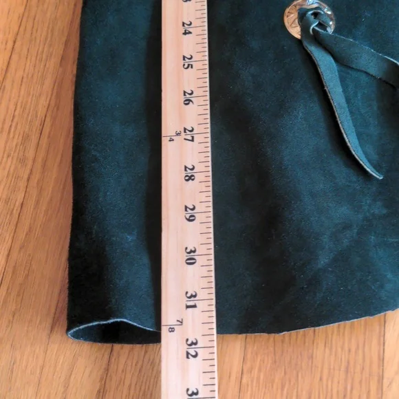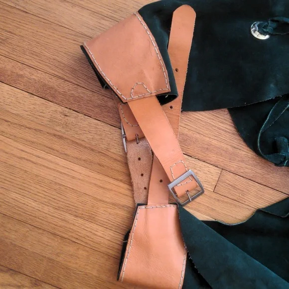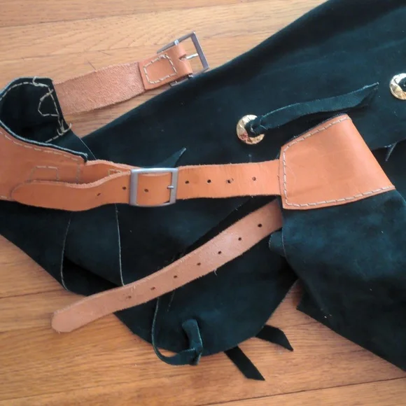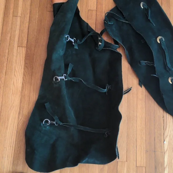 Hunter green Heavy Suede Chaps, for Motorcycle, show, costumes, Cos Play, fun.Worn once, been in storage.Animal and smoke free home.Well made Fully adjustable front and back buckle. Will fit medium to large.In very good condition and ready for you to wear and enjoy. They are for a short person.I am 5 ft 4 and they are short for me unless you wear them down on your hips. Leather for belt is thick and sturdy. Check photos closely.These are beautiful and have inside straps to adjust to your inner leg areas.
