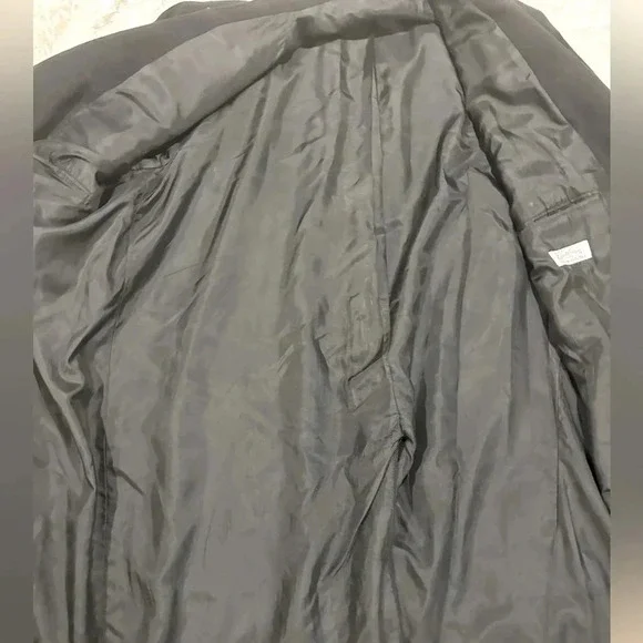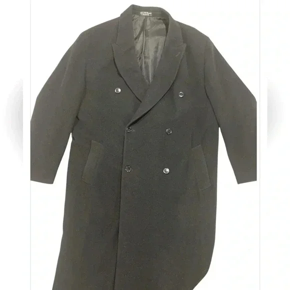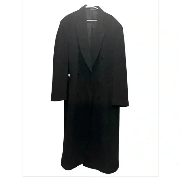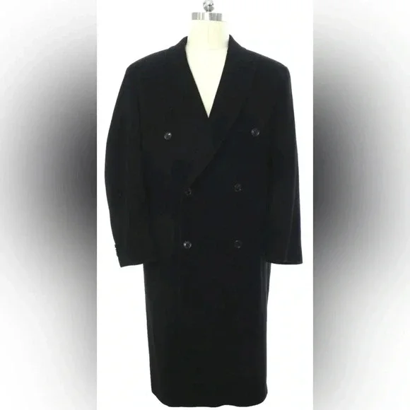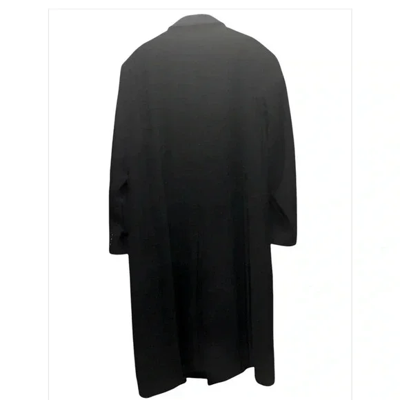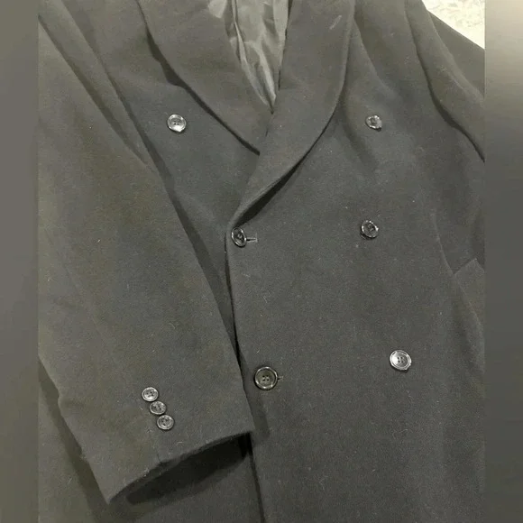 Newer than 90s -Chaps Ralph Lauren- Mens black cashmere wool blend longsleeve double breasted button front overcoat. Fulll length with button accents on the sleeves, a deep back vent. Medium peaked lapel. Lower inset pockets and square hemline. Inside is lined polyesterChest measurements 26 inches Top of the collar to the bottom of the jacket  53 1/4 inches