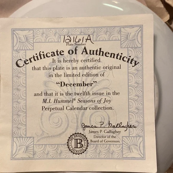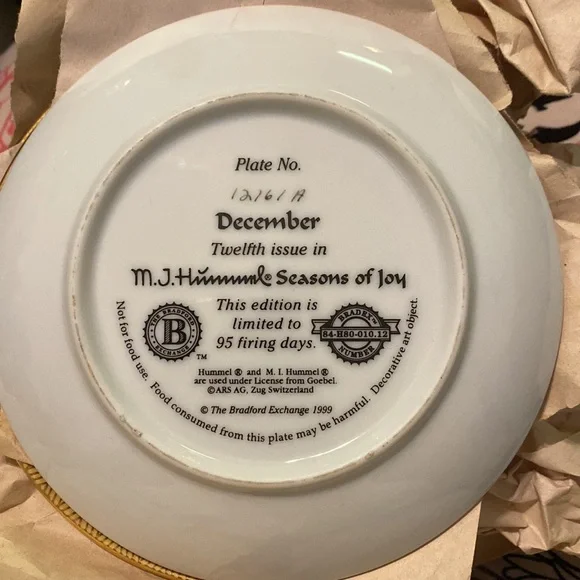 M. I. Hummel Seasons of Joy 6 inch plateThe Perpetual Calendar Collection (bin 1-22 item 18) Complete set of 12 plates. Never displayed. Gold rim. Plate information printed on back of each plate and includes:January "Year's First Snow"February "Valentine's Day"March "A Windy Crossroad"April " Signs of Spring"May "Maypole"June "Carefree Days"July "Summer Stroll"August "Hot Summer Days"September " Back to School"October " Autumn Outing"November " Song of Thanksgiving"December "Holiday Cheer"