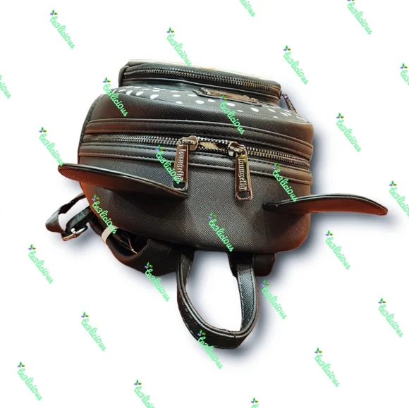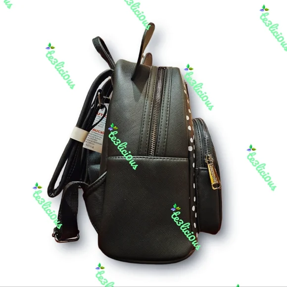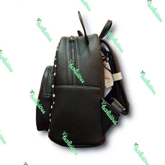 100% AUTHENTIC AND BRAND NEW DISNEY PARKS MERCHANDISE Faux leather mini backpack feature white and black polka dot designScreen Art of Minnie centerScreen Art MINNIE MOUSE bottom backDouble zipper main compartmentFront zip pouchLoungefly logo metal pullsAdjustable padded shoulder strapsTop carry handleSide slip pocketsLining features allover Minnie polka dot printGoldtone hardwarePolyurethane, exclusive of decoration11 1/2'' H x 9'' W x 6'' D (incl. front pocket)Imported