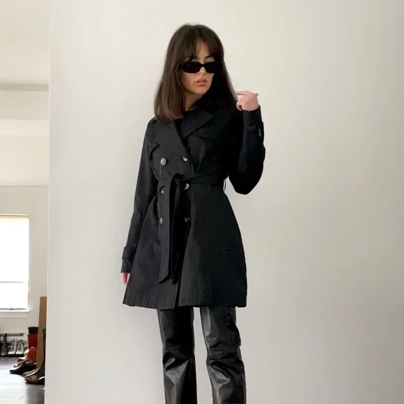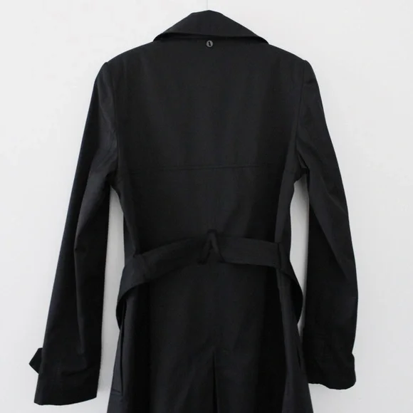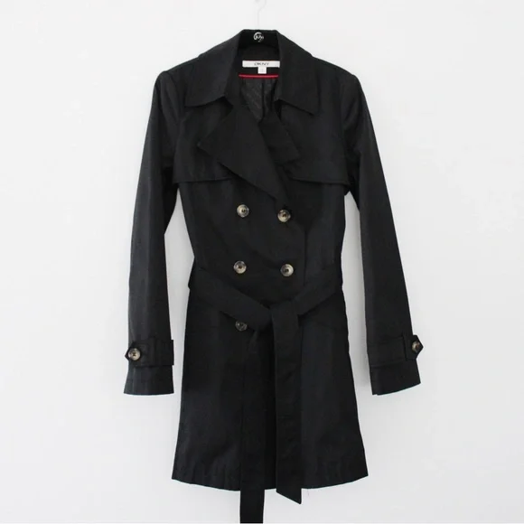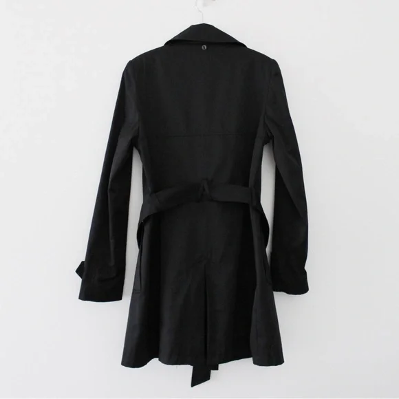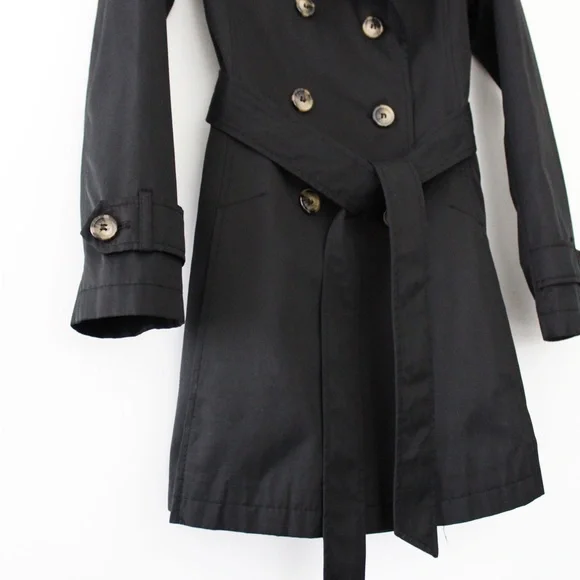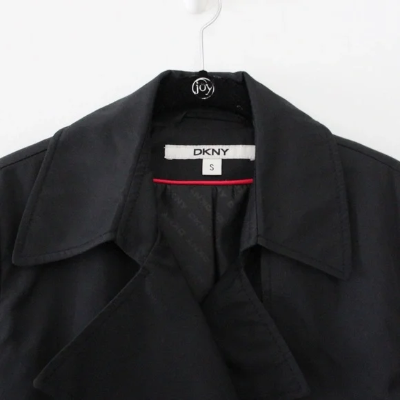 DKNY black, solid, long sleeve, collared, button up, ‘Abby’ double breasted trench coat. Classic, minimal, chic, capsule wardrobe piece. Double breasted button front design with tortoise tone buttons. Adjustable self tie waist belt. Midlength, classic fit. Long sleeves with strap button accents. Notched lapel collar. Side pockets. Printed monogram lining. Excellent condition - preowned, no hood.Shell: 57% cotton, 43% polyesterLining: 100% polyesterBust: 37.5”Length: 33.5”---J3176