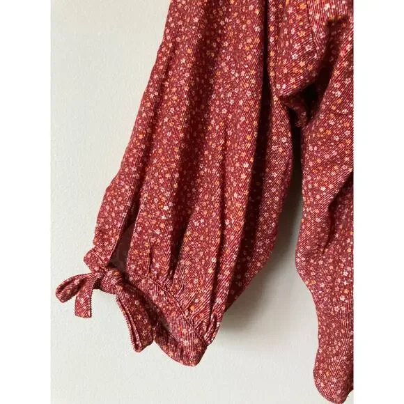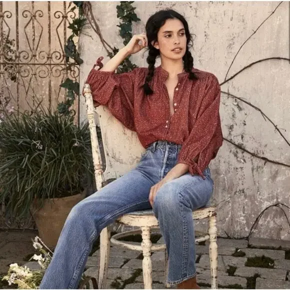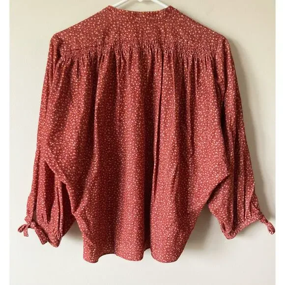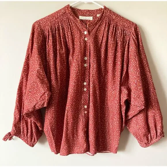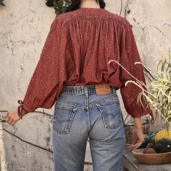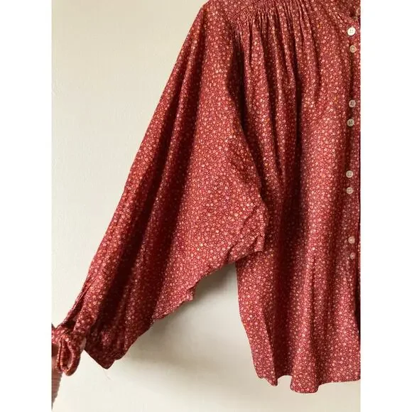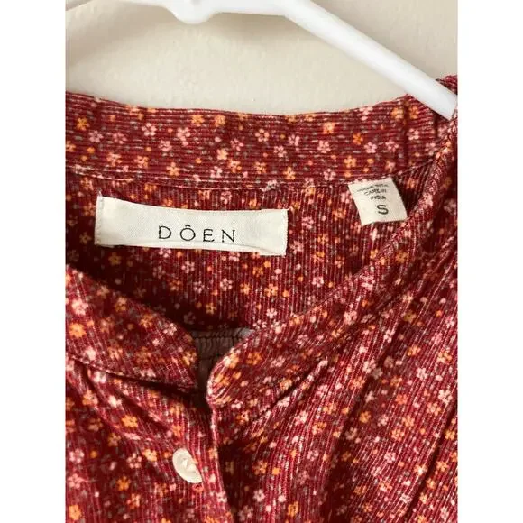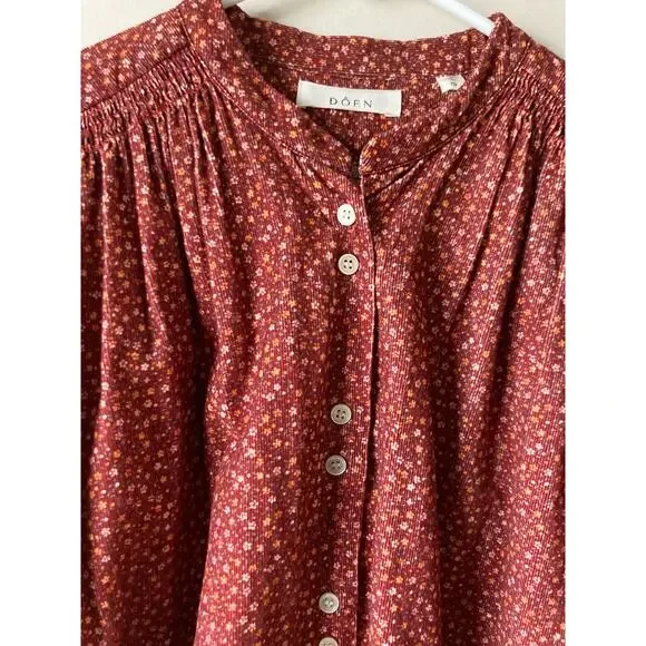 Dôen OKeeffe blouseBurgundy California Wildflower floral printThe DÔEN O’Keeffe Top is our tribute to iconic artist Georgia O’Keeffe, now available in our California Wildflower print. Inspired by vintage painter’s blouses, this top is all about the little details – long tie statement sleeves, shell buttons, and shirring at the yoke and shoulders. Wear it out loose or tuck it into high-waisted jeans.100% cotton corduroyChest 27 1/2"Length 23 1/2"Excellent condition