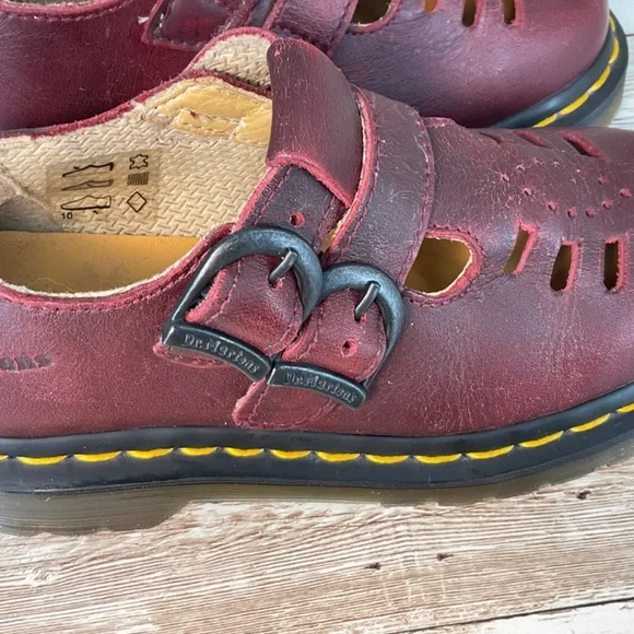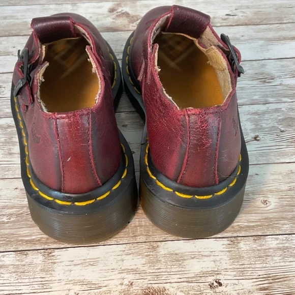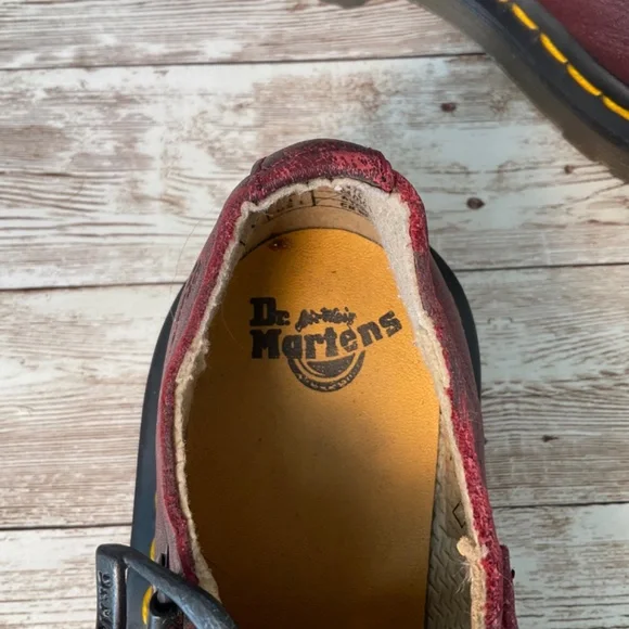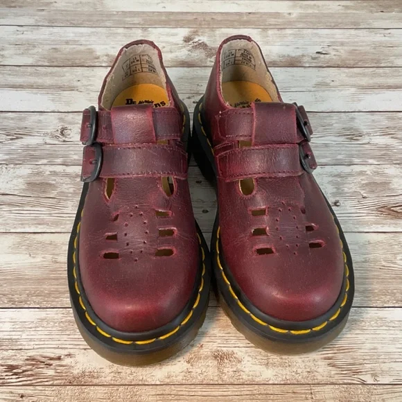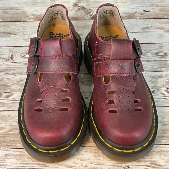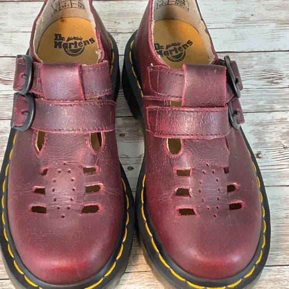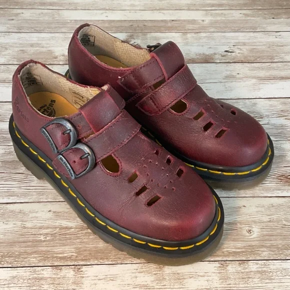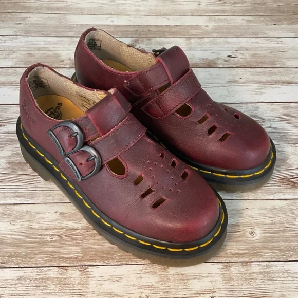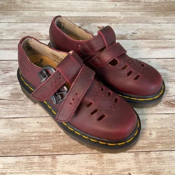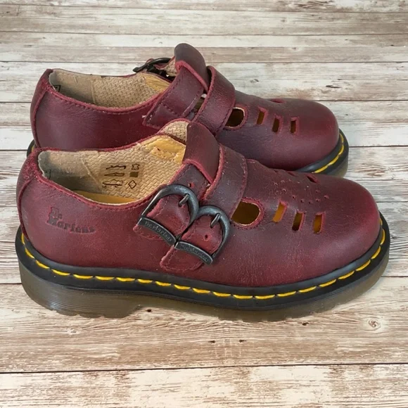 DR MARTENS KIDS COLLECTION OXFORDS CLASSIC MARY JANE STYLE 2 BUCKLE STRAP OXFORDSGet your little one going with classic school styling with Dr. Marten's Kid's Collection Oxfords! Sizing: marked size US 13, UK 12 ***please compare measurements (approximately 9” outsole, approximately 7.75” interior sole)***Cordovan brown genuine Leather upper with eyelet cutouts and brogueing Black metal bucklesLeather and textile lining.Cushioned insole for all-day comfort. Cemented and stitched sole construction for enhanced flexibility and durability. Cleaned and leather conditionedExcellent used conditionPet friendly, smoke and fragrance free home