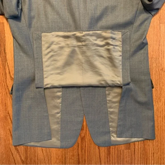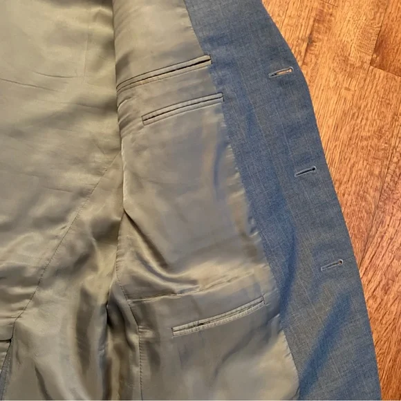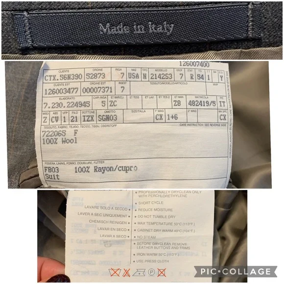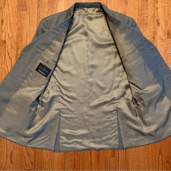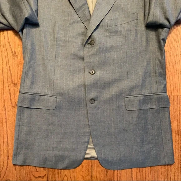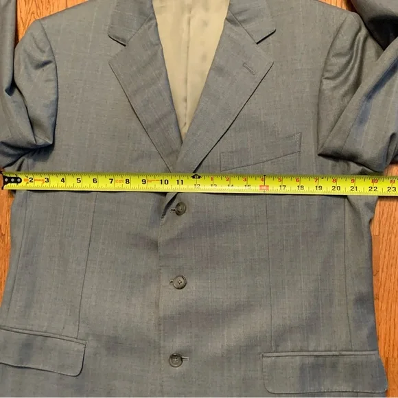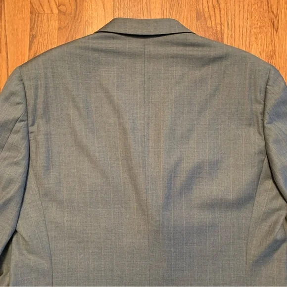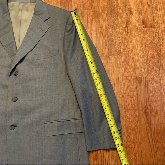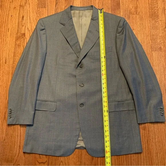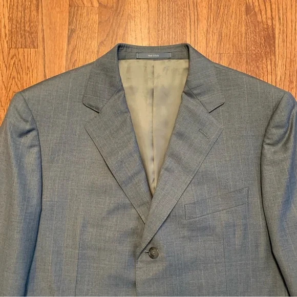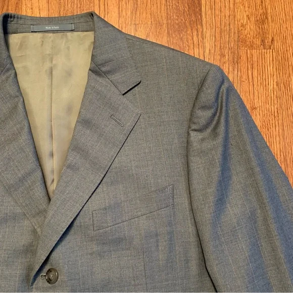 Notched lapel; three-button front closure4 buttons at each cuffWelt pocket at chest; welt pockets at hipDouble ventFully linedOne interior pocket on the right side and 3 interior pockets on the left sideMade of 100% wool, light gray with thin peach lines Made in ItalySize 54R Italian, converts to US size 44R. Please see measurements to determine proper fit Great condition