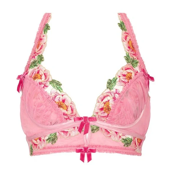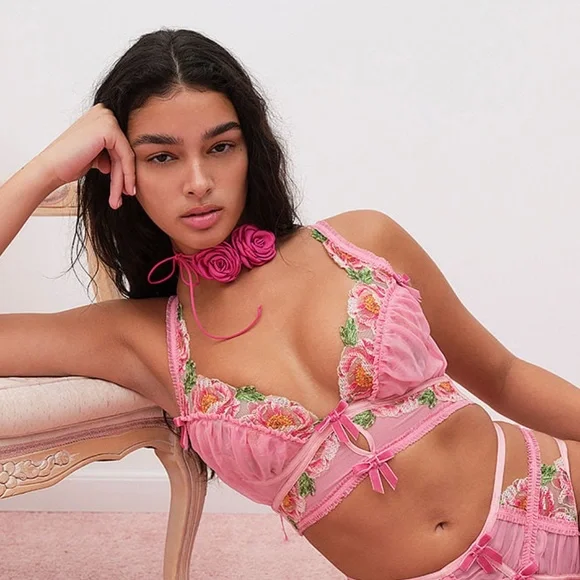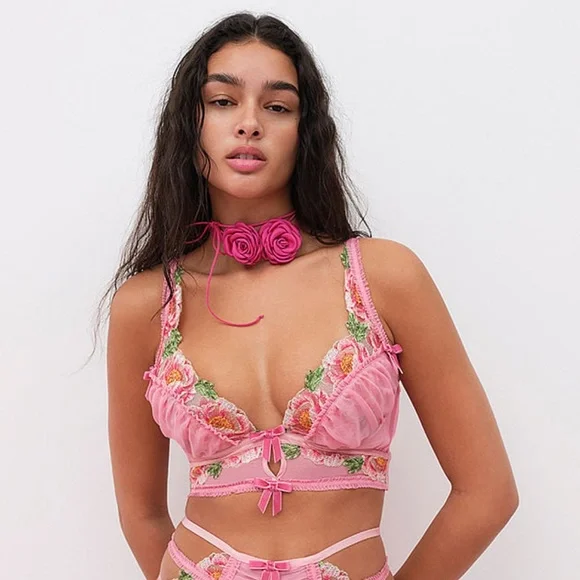 For Love And Lemons Needle Point Roses Corset Top Pink Medium NEWCondition: New In PackageSize: MediumColor: Pink Multi Color Everything's coming up roses. Blooming with lush embroidery, velvet bows, and airy chiffon, this one is a fresh pick. Lift & LiningUnderwireUnlinedStraps & HooksDouble adjustable strapsBack hook and eye closures Details & FabricCage backGathered chiffon at cups & side panelsRuffled elasticPartially made with recycled materialsHand wash, lay flat to dryImported