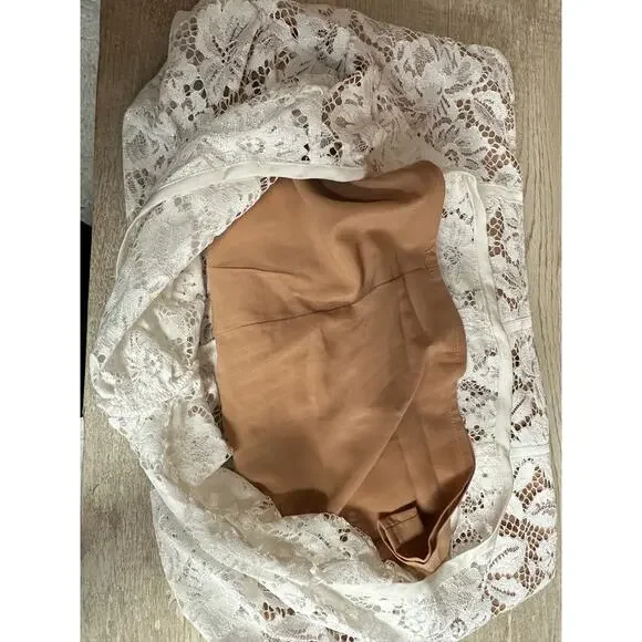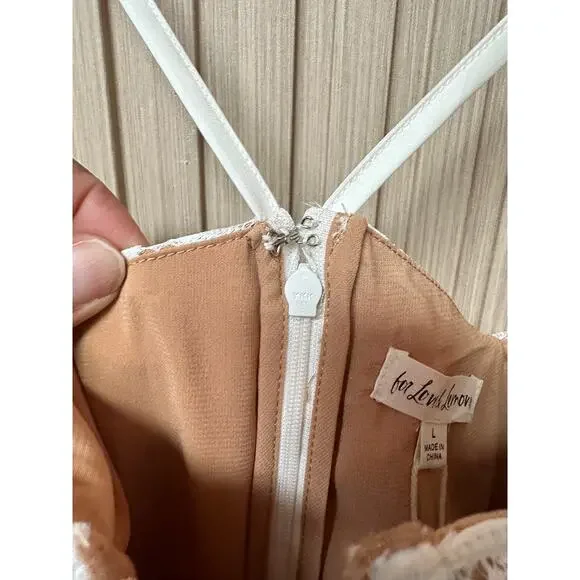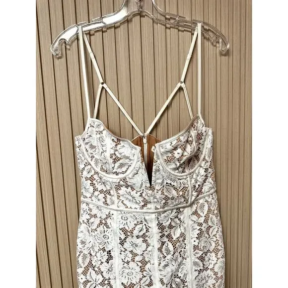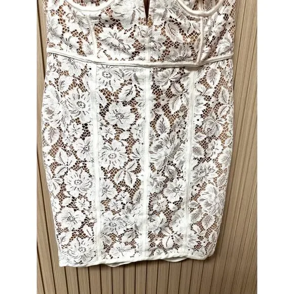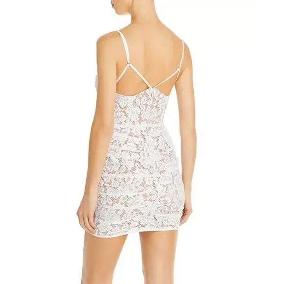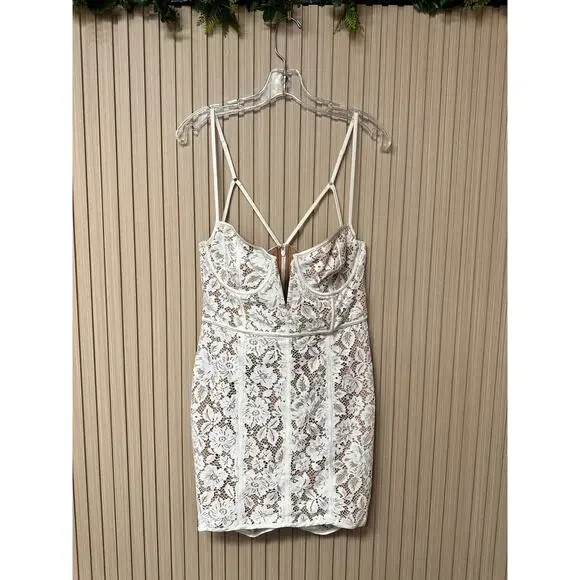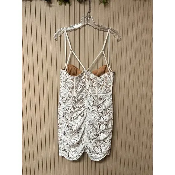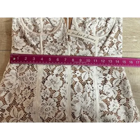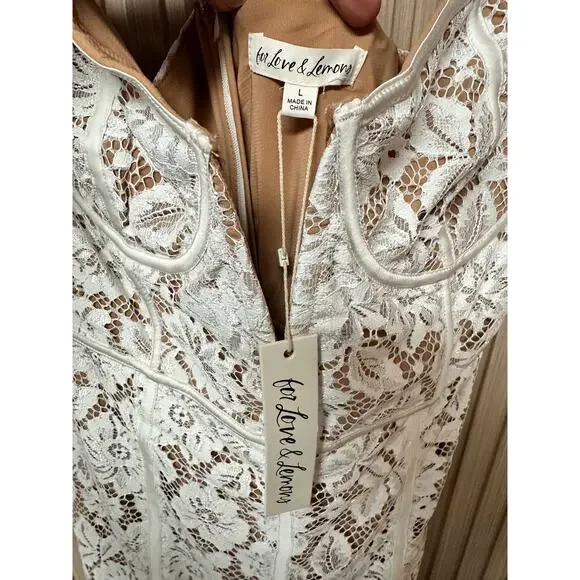 For Love & Lemons Julia Lace Mini Dress Sz LBrand new with tags. Retail Price: $223SIZE & FIT- Fits true to size- Body-hugging fit at the bust, waist and hip- Non-stretch fabric- Designed for a mini length- Approx. 32" from high point shoulder to hem, based on a size smallModel measurements: 5'10" height, 33.5" bust, 23.5" waist, 34.5" hips, wearing a size smallPRODUCT DETAILS- Sweetheart neck with V-wire at center- Adjustable spaghetti straps with triangle back- Underwire cups- Bustier seaming at bodice and front skirt- Shirred back skirt- Allover floral lace- Back concealed zip closure- LinedMATERIALSelf: 100% polyester; contrast: 97% recycled polyester/3% spandex; lining: 98% recycled polyester/2% spandexP03-40