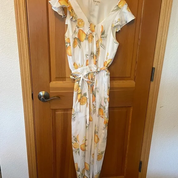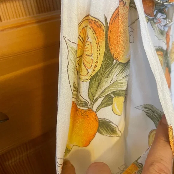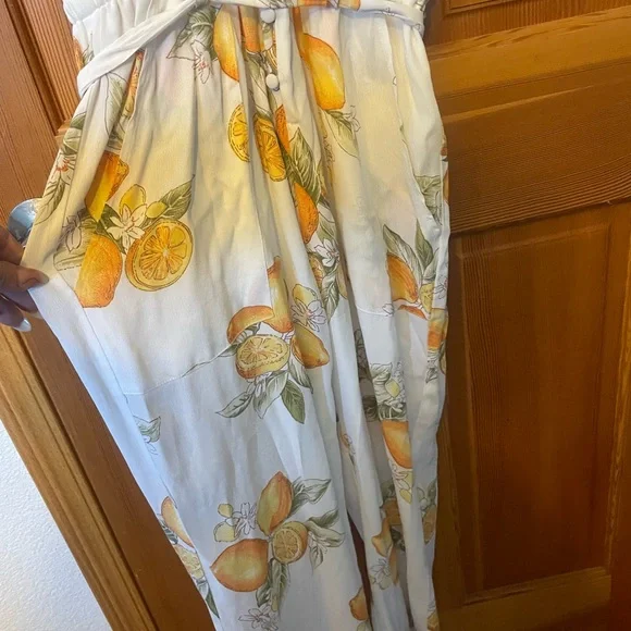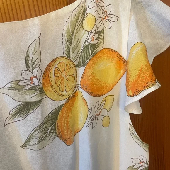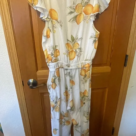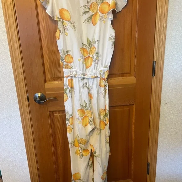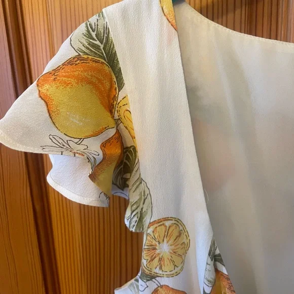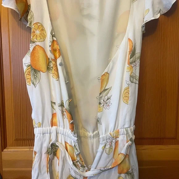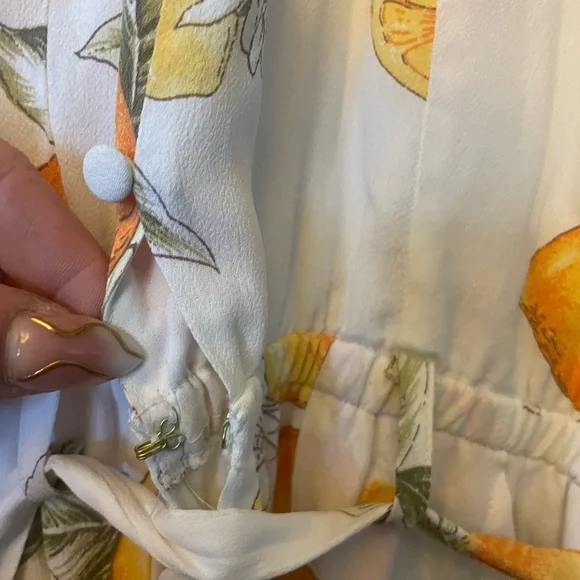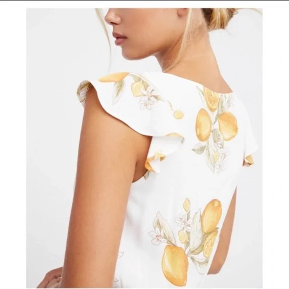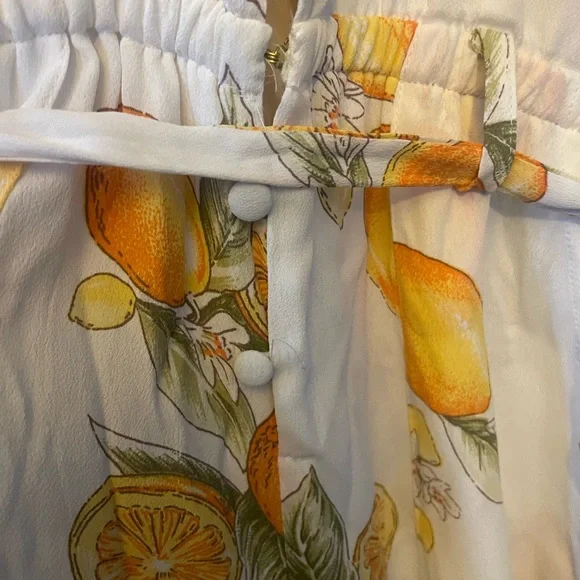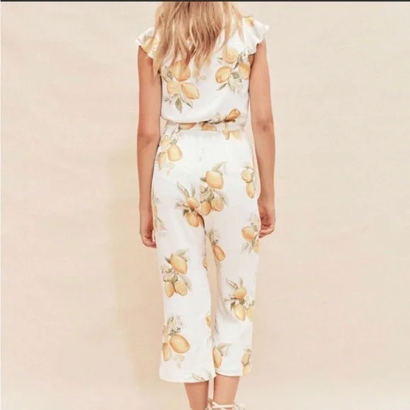 Never worn! Sold out! Refreshed in a cool lemon print, this cropped silhouette features front buttons, a tie waist, and flutter sleeves. FOR LOVE & LEMONS FOR VICTORIA’S SECRET: An exclusive collaboration that blends dreamy confidence with thoughtful detailing, giving each piece a unique and feminine feel.Easy fitV-neckPartially linedTie waist with belt loopsSide pocketsFront buttonsPartially made with recycled materialsDry cleanImportedPaid $239 plus taxSold out on revolve, amazing summer statement piece!