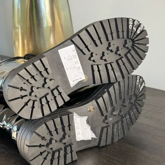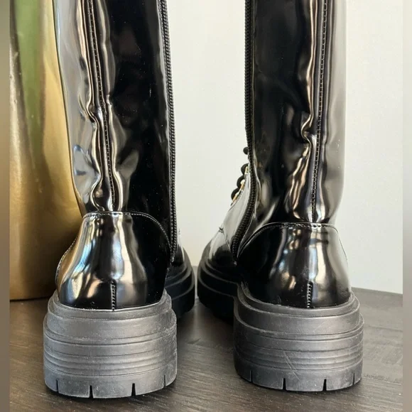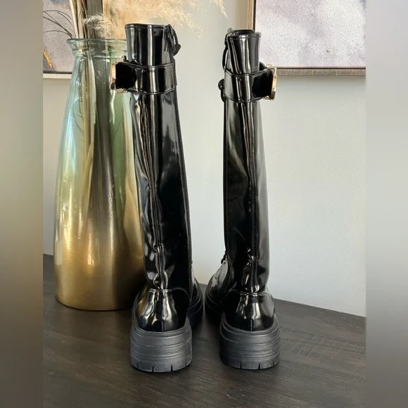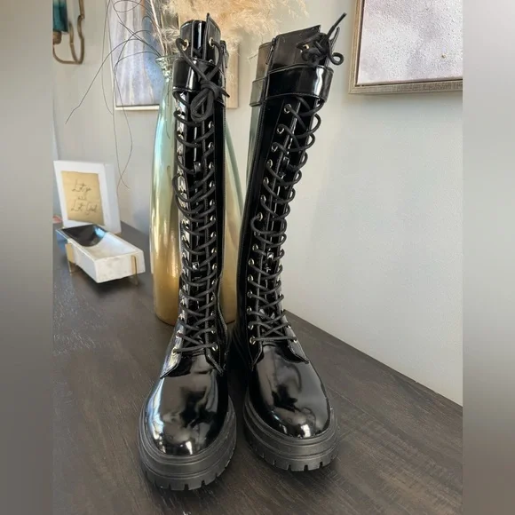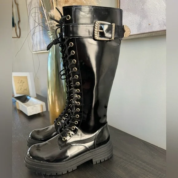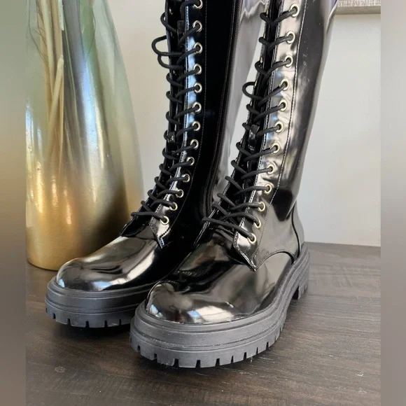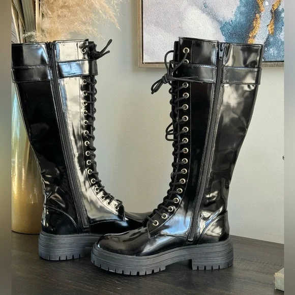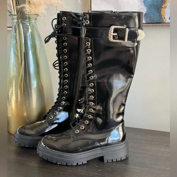 Gianni Bini Black Patent Skyscraper Lug Sole Knee Boots Lace-up Buckle Size 6.5 NewBlack shiny with a slightly more matte sheen than high gloss patent. Lace up the front but side zippers make them easy off and on.Gold buckles on the side and gold shoelace holes. Lug sole with about a 1” platform. These are new without the box. They have never been worn and have tags still on the soles. They do have small little marks here and there from being in my closet.