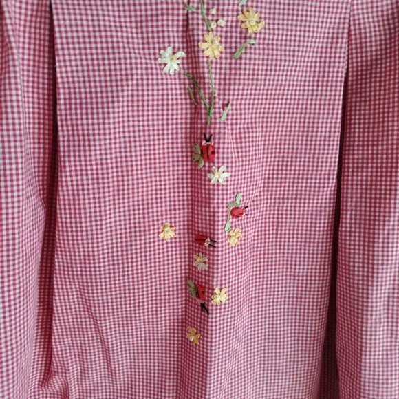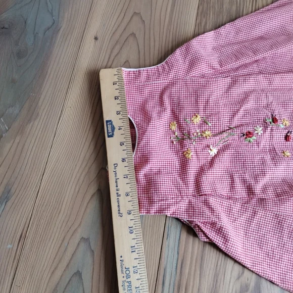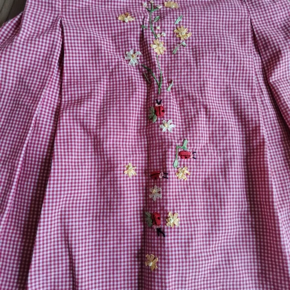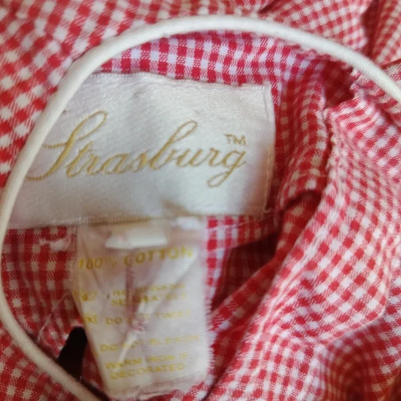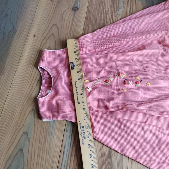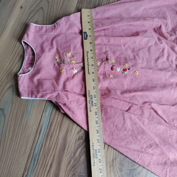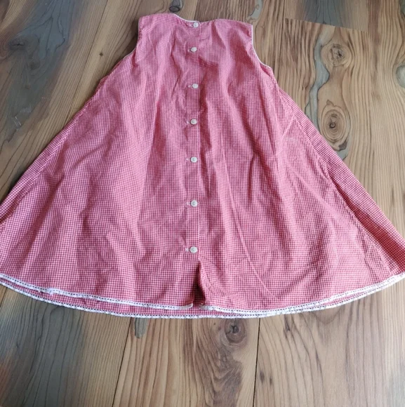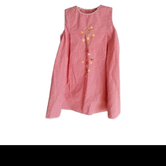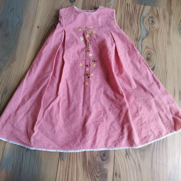 Charming pink gingham dress with floral embroidery. Sleeveless design for a classic look. This Strasburg dress features a lovely red plaid pattern with delicate embroidered accents. The dress has a round neckline and a sleeveless design, making it perfect for a summer or spring party. The knee-length dress is made of a blended fabric and has a fit and flare style, which accentuates the waistline.The dress is suitable for girls in size 5 questionable, have no size please see pictures . and has a chest size and waist size that can be seen in the pictures provided. It is ideal for both casual and party occasions, and its features include a floral design and a button closure. The dress is not vintage or handmade and is in excellent condition. (P21-8)