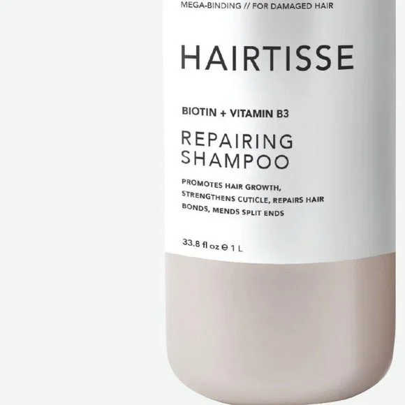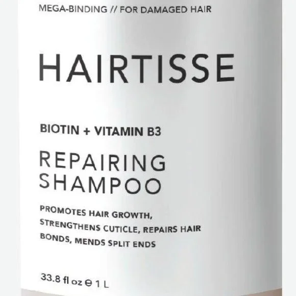 HAIRTISSE Biotin + Vitamin B3 Repairing Shampoo 33.8 oz 1 L WHAT IT IS This shampoo repairs hair bonds, seals split ends, strengthens hair structure and promotes hair growth. 33.8 fl oz. Made in USA. WHO IT'S FOR For damaged hair. HOW TO USE IT Apply to wet hair and massage into a lather. Rinse thoroughly.