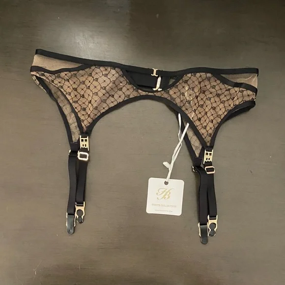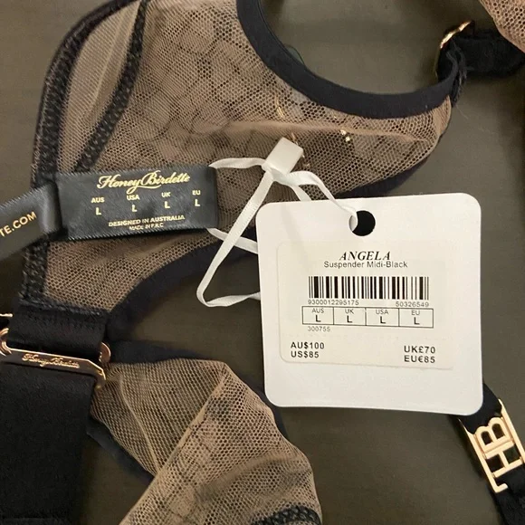 Honey Birdette Angela Suspender, Size L, New With Tags.Logo lingerie you’ll actually want to wear. Designed in a day-to-night style, Angela is the ultimate monogram collection with nude crystal tulle and an exclusive HB pattern. Made by our expert designer and the Swiss embroidery team, Angela is the classic cool-girl style that will elevate your underwear drawer.HB logo garter beltMonogram embroidery on nude tulleCustom logo slides with real gold-platingEdgy cut-outs on front & sidesAdjustable garter belt strapsFully adjustable fit & back e-hook