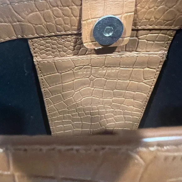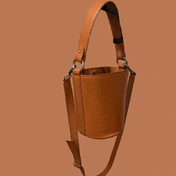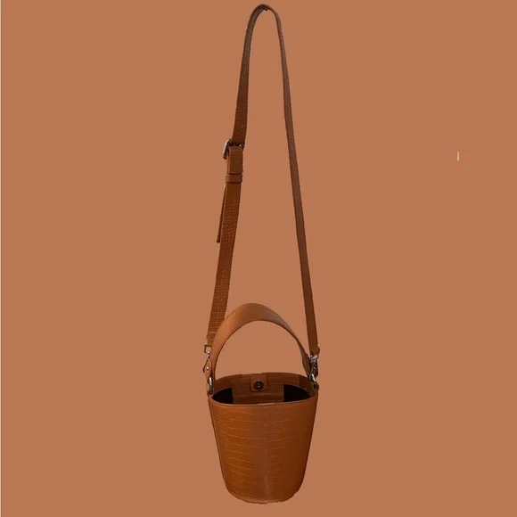 Our signature silhouette comes in a bite-size mini version, as convenient as she is cute. An iconic structured bucket bag silhouette, the body is inherently spacious despite the "mini" size, fitting a medium size wallet amongst your daily essentials. With two removable straps, you can easily customize her based on your 'fit or your lifestyle needs (hello, hands free!).Brand: Hyer GoodsSize: Top Handle Drop: 7" / Crossbody Strap Drop: 21-24" / Height: 7 1/2" / Width: 7" / Depth: 6" (at base)Material: 100% genuine leather, sourced from local leftovers / Lining: 100% recycled polyesterCondition: Used - ExcellentFlaws: None visibleShipping: Standard shipping#hyergoods #sustainable #crocodile #leather #chictagged Staud for similar brand category