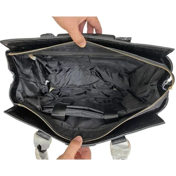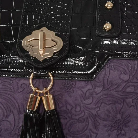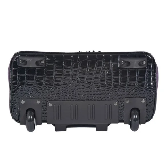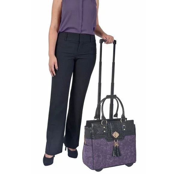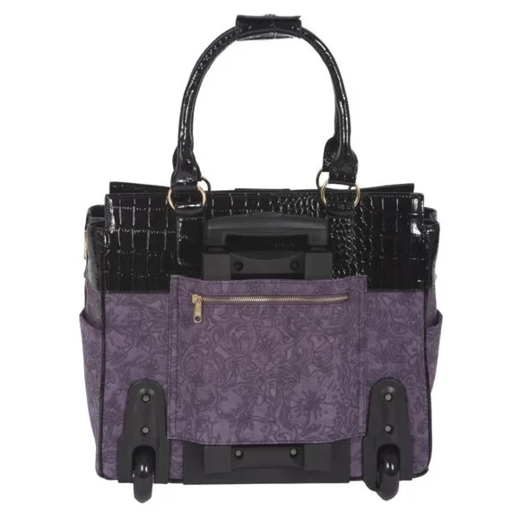 Arrive in style with the elegant black patent and purple floral rolling laptop bag. Plenty of room for your laptop, cords, charger, books, files and more! The perfect rolling tote for work, travel, college or daily shopping. Give your shoulders a break and the wheels carry the weight for you.- Purple floral faux leather exterior with black patent style faux alligator trim.- Gold tone hardware plus a lovely pendant. Zipper top closure.- Padded pocket will fit your tablet, iPad, 12", 13", 14", or 15.6" laptop.Laptop screens are measured from one corner of the viewable screen area to the opposing diagonal corner. Do not include the casing or black trim in your measurement.- Fully lined new black interior with five (5) pockets. An additional two exterior side pockets plus a back side zipper pocket. - Pull out retractable handle & two durable black all-terrain wheels for easy mobility.- Dimensions: (Length x Width/Depth x Height)16.25” L x 9.5” Depth/Width (8.25" without retractable handle) x 15.5” High