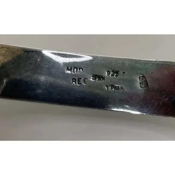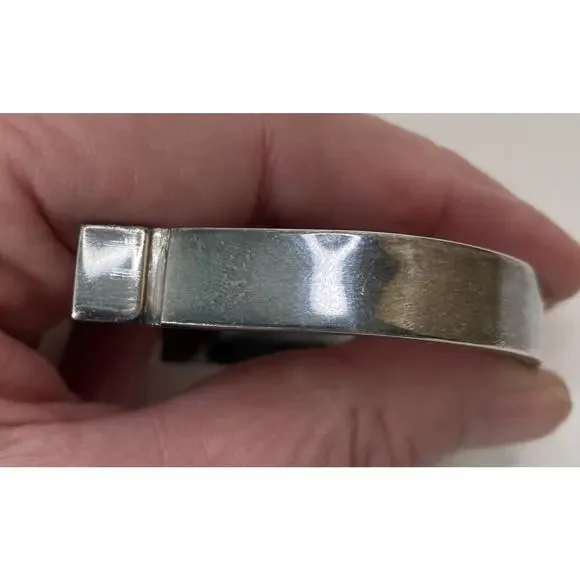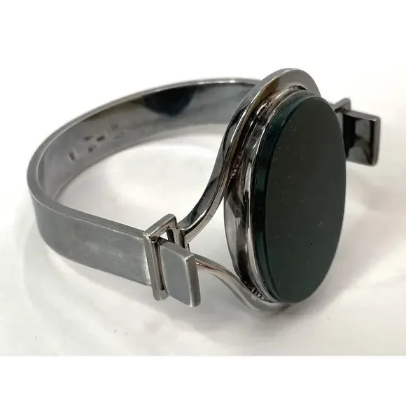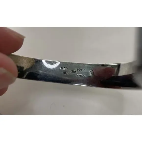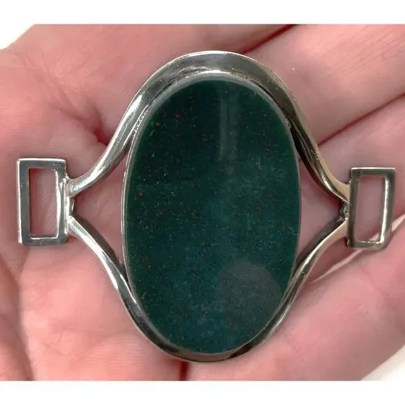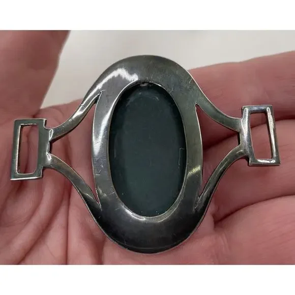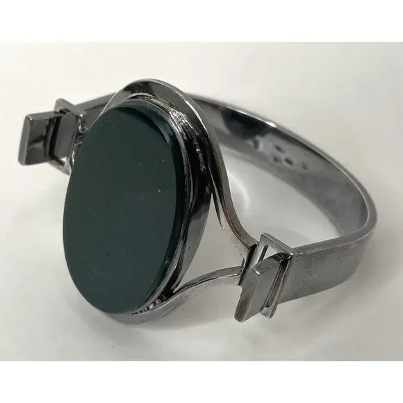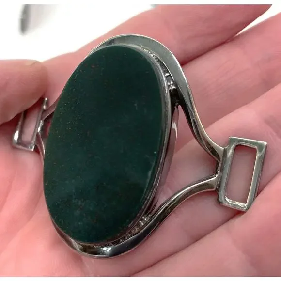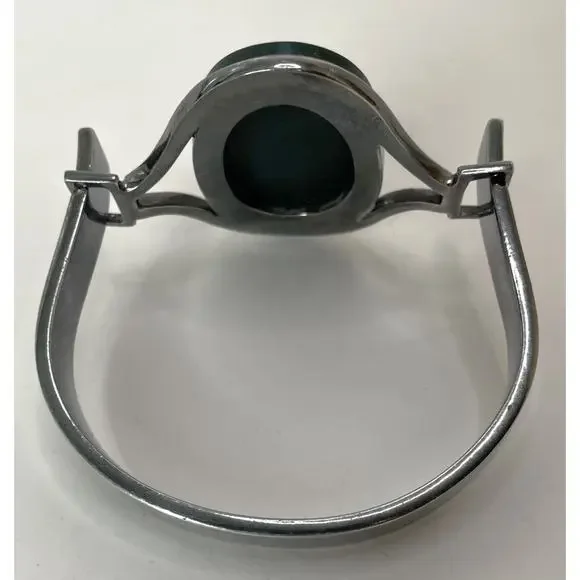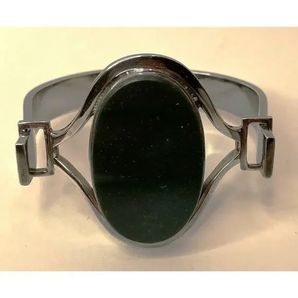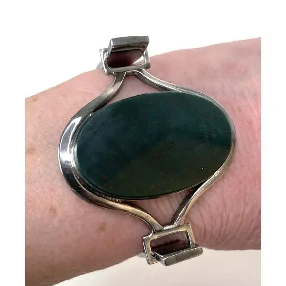 Joachim S'Paliu 925 Sterling Silver MCM Bracelet Green Agate / Serpentine / Chrysoprase (?)Signed / Hallmark / 925 / S'PaliuMy consignor doesn't remember the stone butIt is very, very dark green w/ some red/orange flecks throughoutYou push the horse shoe shaped sides in and the front comes offWill fit up to 7.5"SpainPatina - I'll leave it up to buyer to polish or not