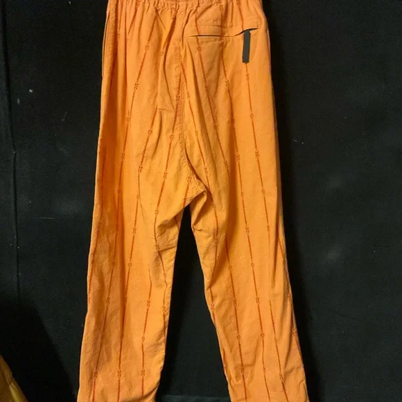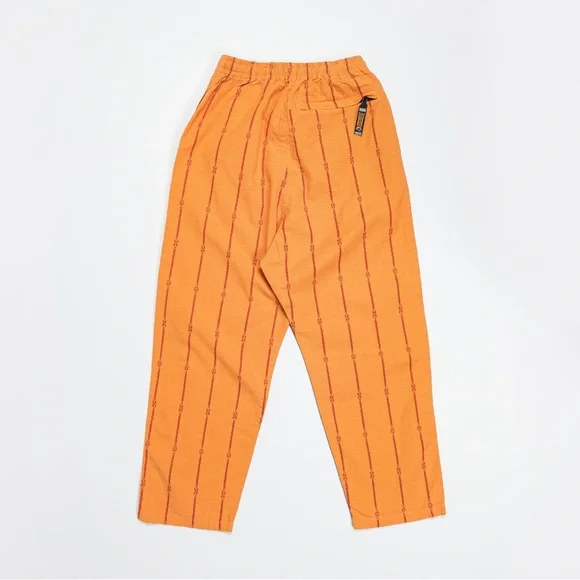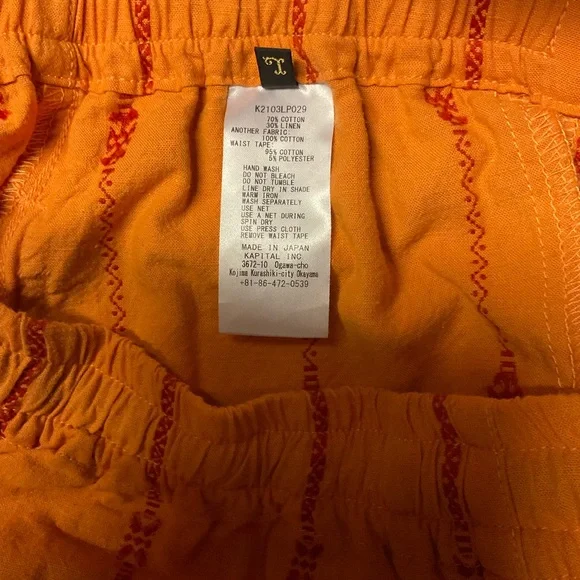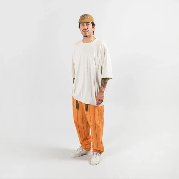 Easy pants made from cotton linen with an exotic stripe pattern. Made of cotton linen for a refreshing feel. The elastic waist uses sashiko tape on the front cord.This product uses natural materials and values the characteristics and unique texture of the materials. Therefore, there are some variations in facial expressions and sizes. Repeated washing and wearing may cause twisting, distortion, expansion and contraction. The pants are adorned with a timely ‘NO NUKES’ print, drawing from the Kapital favourite 60s and 70s hippie movement.70% cotton 30% hempSizes: 2/M w:35 h:17 l:254/L w38.5 h:46.5 l:25