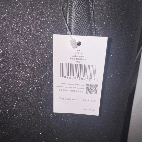 Kate Spade Glitter Tinsel Tote in BlackRetail $359New with tags Style NumberK9338MeasurementsLength: 4.0"Height: 12.44"Width: 11.28"MaterialsGlitter fabricSaffiano PVC trimTwo way spade jacquard liningHandleHandle Drop: 10.00"FeaturesInterior front slip & back zip pocketDrop in top zip closureMetal pinmount logoDust Bag Included: No