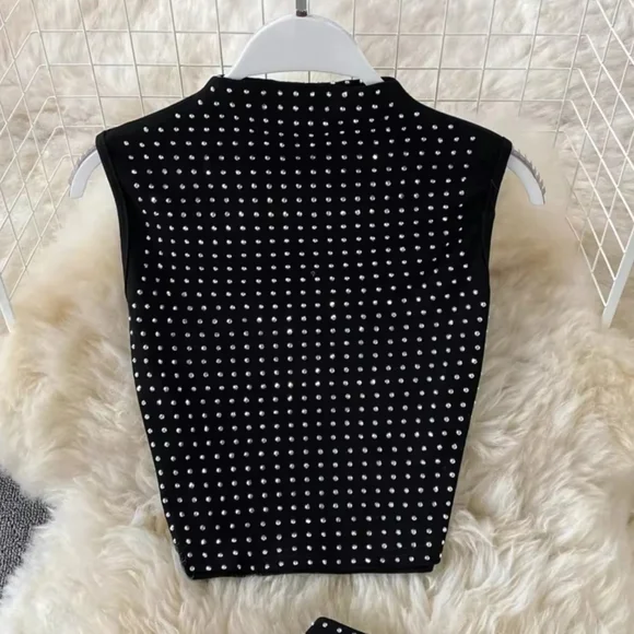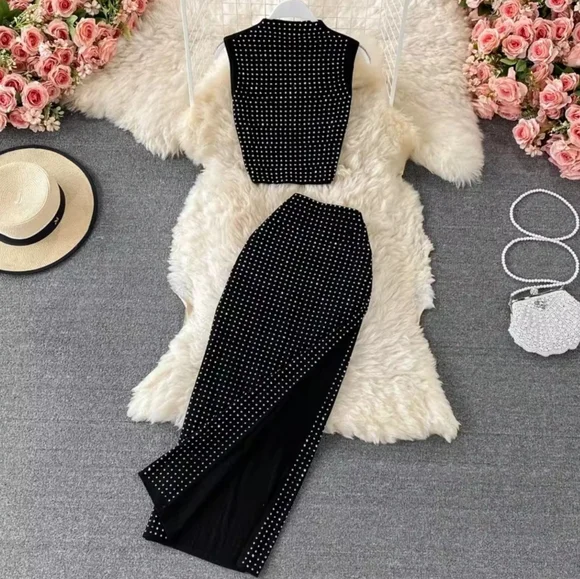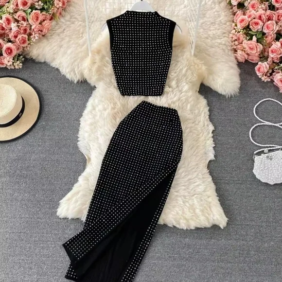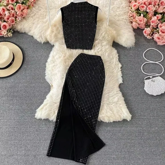 Ladies Two Piece Set Outfits Stand Sleeveless T-shirt + Long Skirt