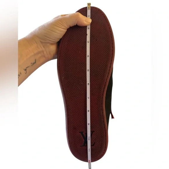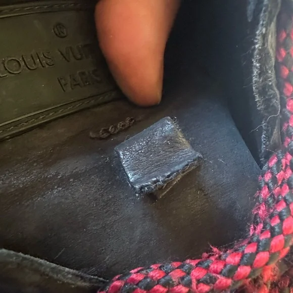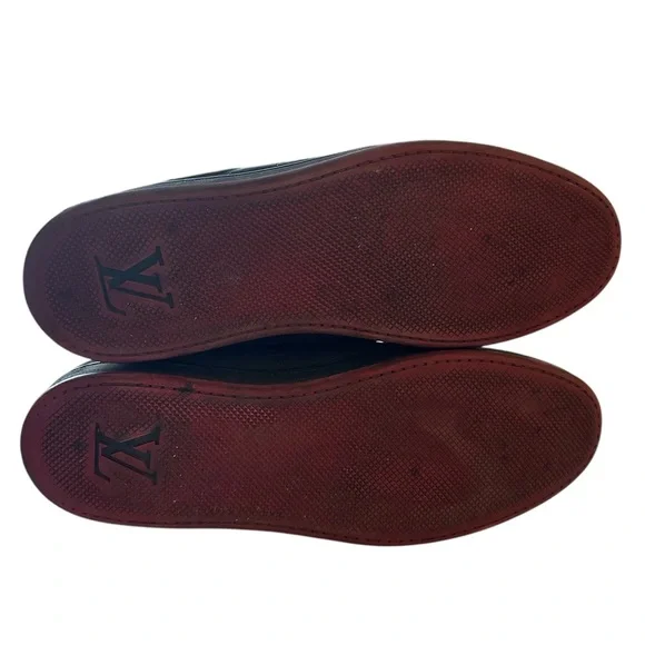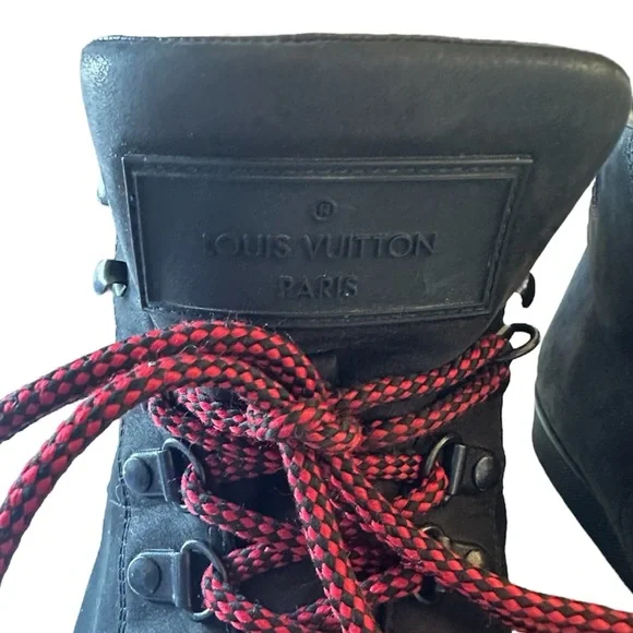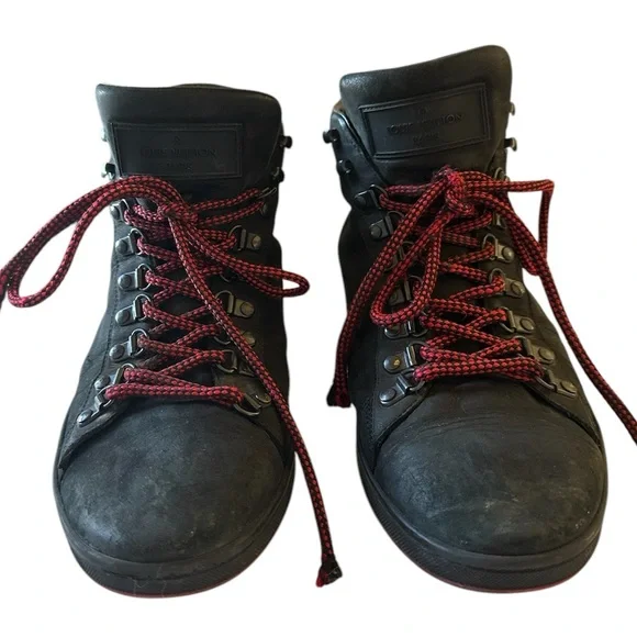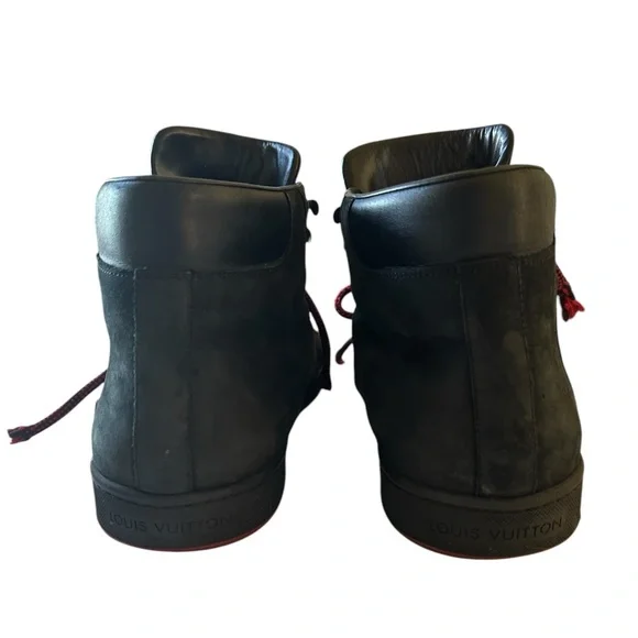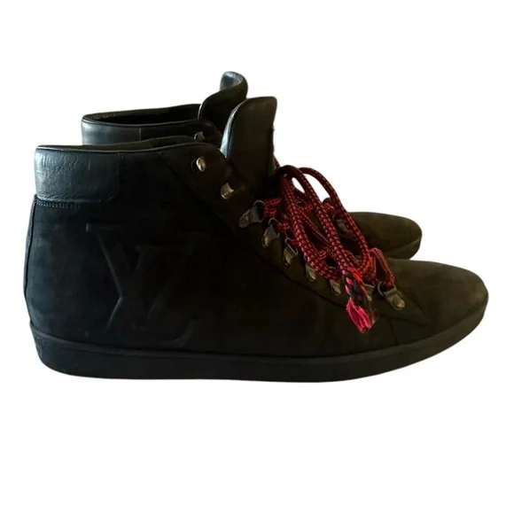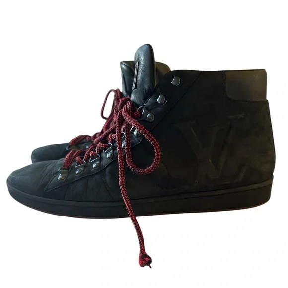 Brand: Louis Vuitton• Model: LV Trainer• Design: High-top, black nubuck leather with red laces• Features:• LV monogram on the side• Metal eyelets for laces• Contrasting red sole• Inspiration: Vintage basketball sneakers• Artistic Director: Originally designed byVirgil Abloh• Material: Calf leather, and nubuckTongue loop on one shoe is ripped. See last pic. Good condition.