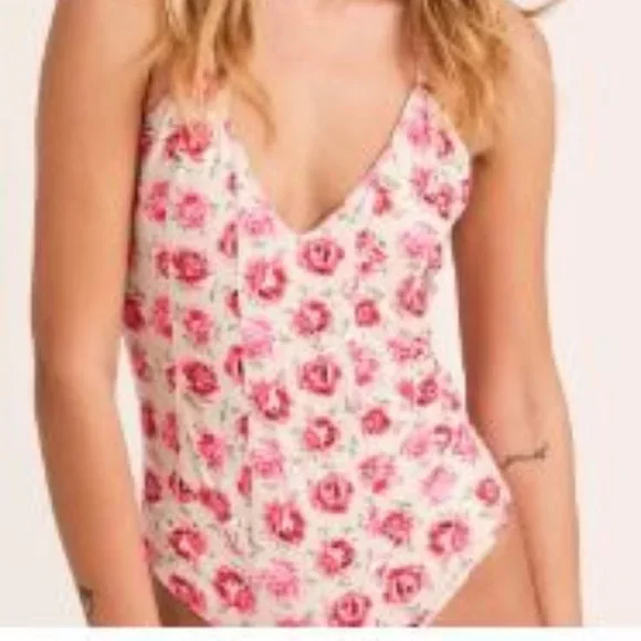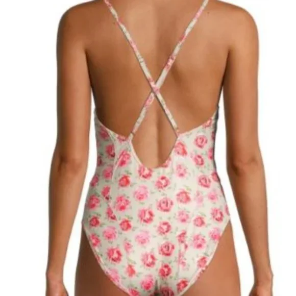 This LoveShackFancy one-piece swimsuit features a vintage-inspired rose print and a low back with cross straps.Plunging V-neckCross-back adjustable spaghetti straps87% polyester/13% spandexHand washImportedSIZE & FITAbout 27" from shoulder to hemModel measurements: 5'10" tallModel is wearing a US size SmallBrand new, with tags. No issues.