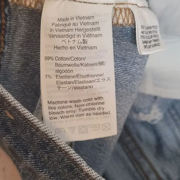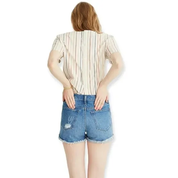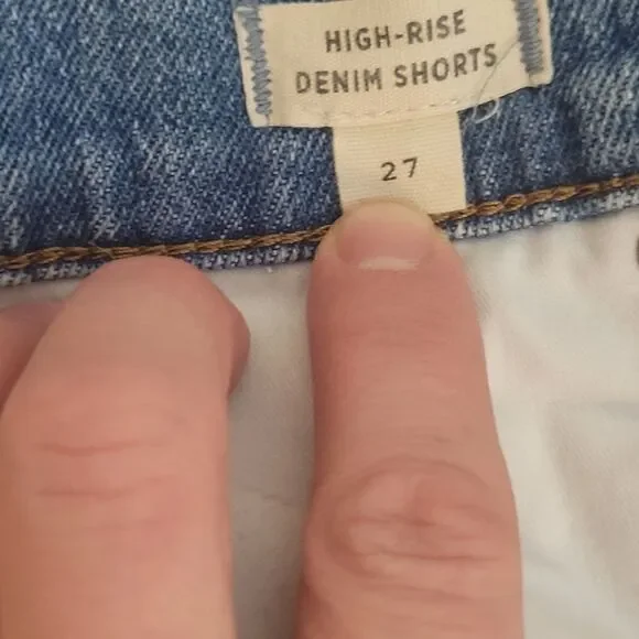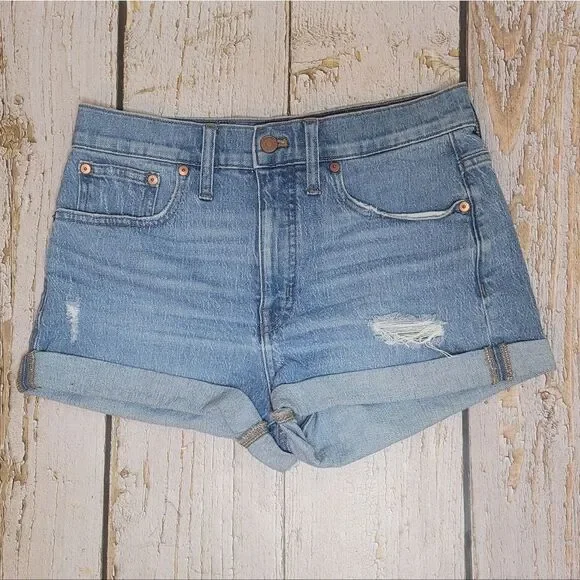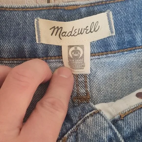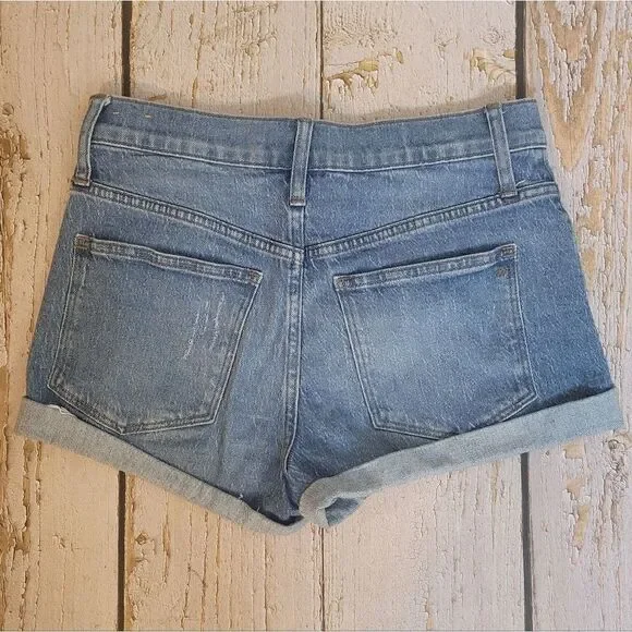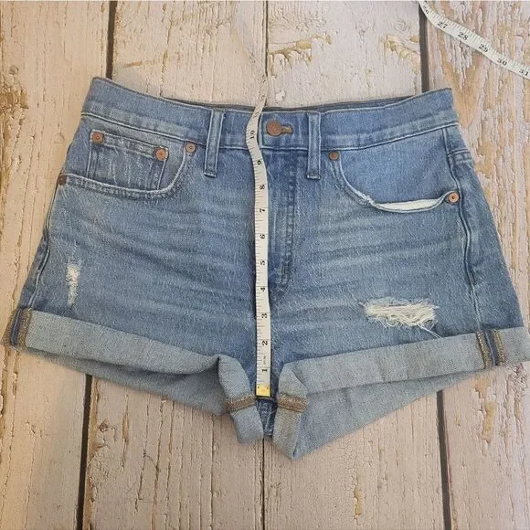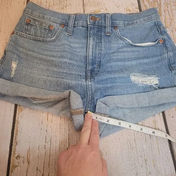 Madewell High-Rise Denim Shorts Size 27 inch waist With a super-flattering (and just a bit vintage) high rise, these distressed denim cutoffs are definitely on the sexy side and, bonus, have our sleek Magic Pockets in front. Feel-good bonus: They were made at the Fair Trade Certified™ Saitex factory, which uses renewable energy and recycled H20. Plus, for each product manufactured, Madewell contributes to a Community Development Fund managed by the workers.True to size.Front rise: 11"; inseam: 2".99% cotton/1% spandex denim.