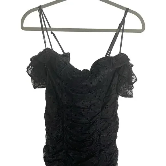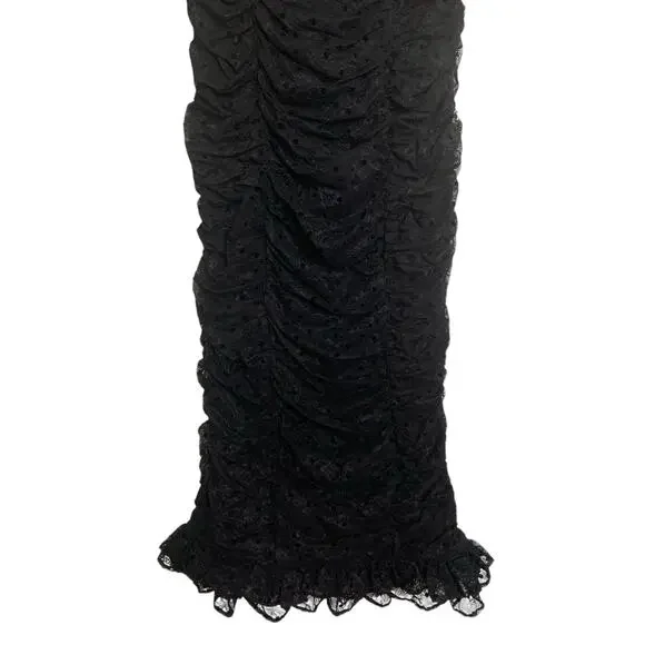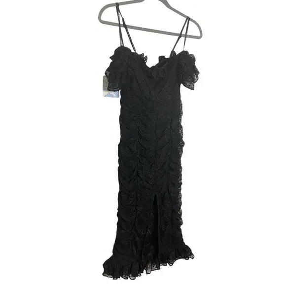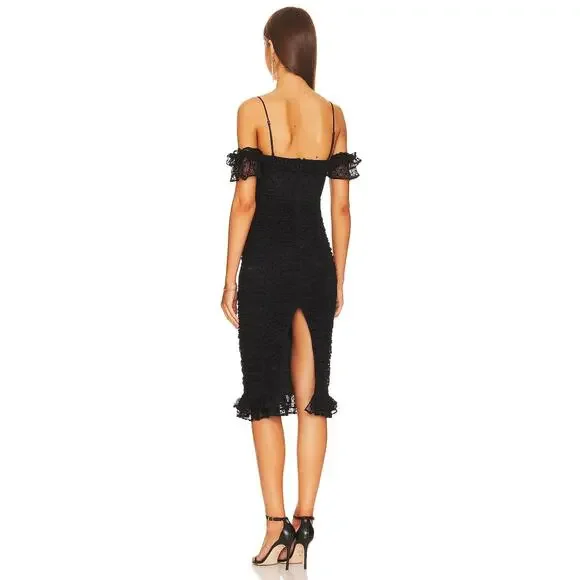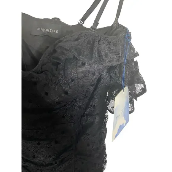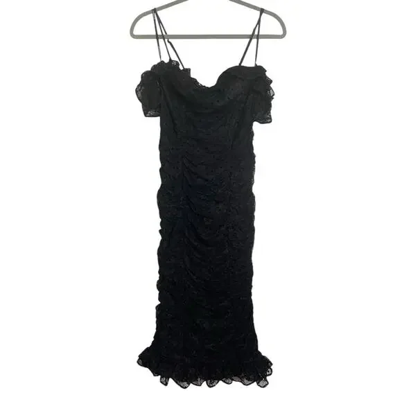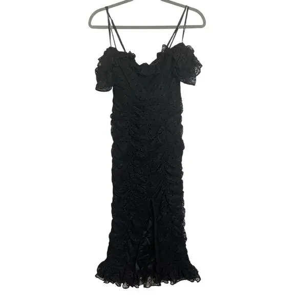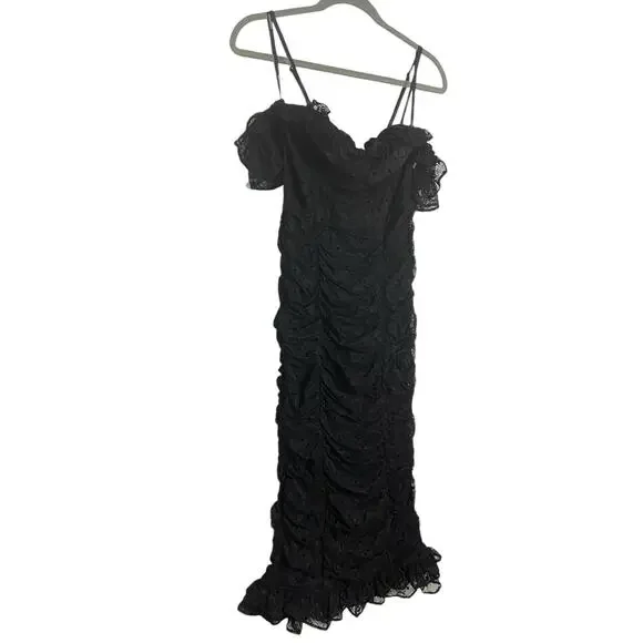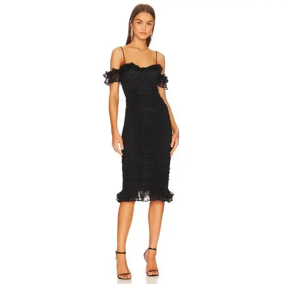 The Majorelle Clare Lace Midi Dress in black features intricate lace detailing with ruffle and ruched accents, offering a romantic and feminine silhouette. With adjustable straps for a customized fit, this midi dress is both elegant and versatile, perfect for formal events or date nights.Fully linedHidden back zipper closureAdjustable shoulder strapsBack ventLace fabric with ruched detail throughoutPolyester blendImportedDry clean recommendedCondition: Very good condition.MSRP: $268Approximate measurements:Pit To Pit: 14"Waist: 12"Length: 44"Sleeve: 4"Tags: happy hour, designer, upscale, luxury, brunch, dinner, special occasion, date night, dates, spring, fall, classy, elegant, wedding guest, prom, party, stylish, trendy, preppy, holiday party, christmas party, thanksgiving, sexy, mother of the bride, photoshoot, high end, old money, quiet luxury, gothcore, whimsical, dark princess queen, grunge