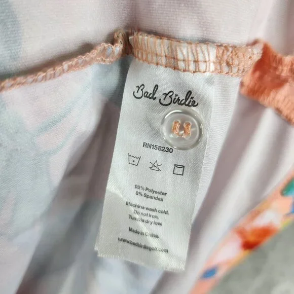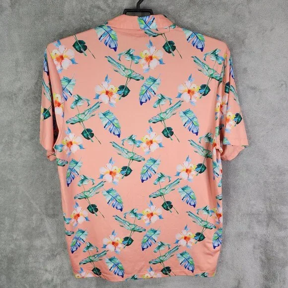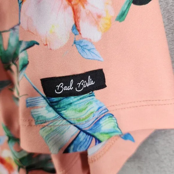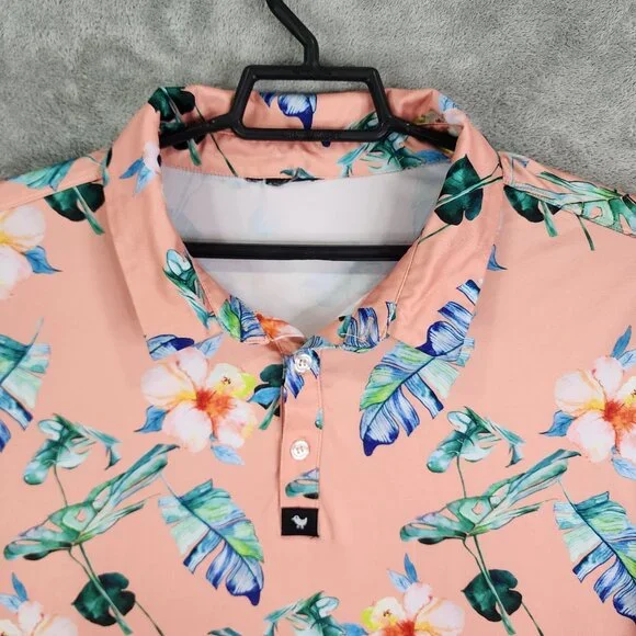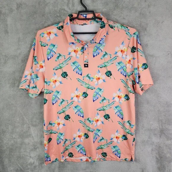 This Bad Birdie polo shirt features a vibrant floral design in peach, offering a stylish and comfortable fit for casual occasions. Made from a blend of polyester and spandex, it ensures durability and flexibility. Ideal for those who appreciate unique and colorful attire.• Short sleeve design• Button-up collar• Lightweight and breathable• Machine washable• Made in China