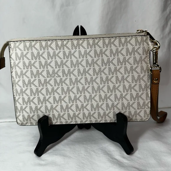 Elevate your evening ensemble with the Michael Kors Clutch Pouch Metallic Cutout, a stunning fusion of modern design and timeless elegance. Its striking white exterior, accentuated by radiant gold cutouts, captures the light beautifully, making this clutch the perfect accessory for those special nights out. Whether you’re attending a glamorous event or enjoying a sophisticated dinner, its innovative design ensures you’ll make a memorable impression while keeping your essentials stylishly organized. Embrace the allure of luxury with this captivating piece that resonates with the discerning fashion lover.Measures 8” x 5”