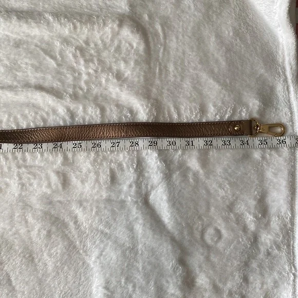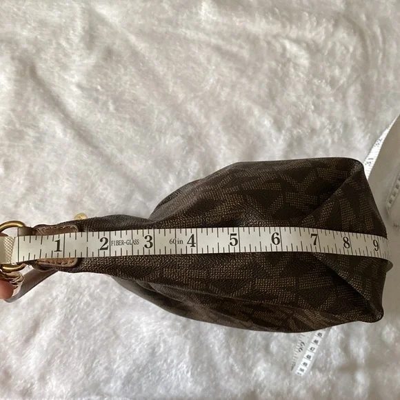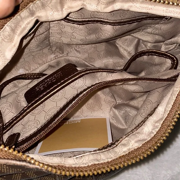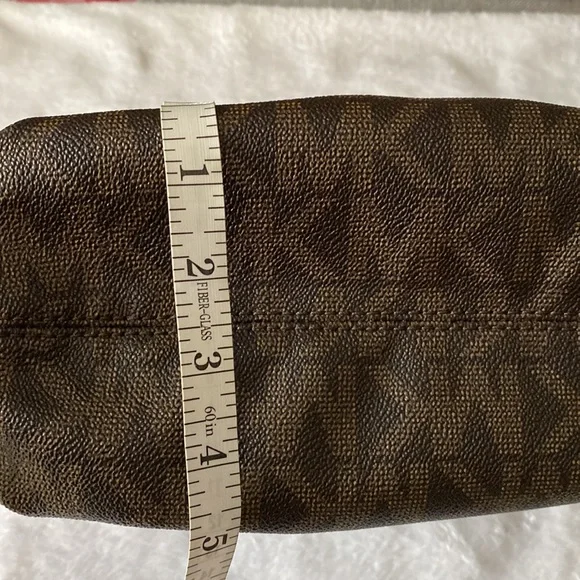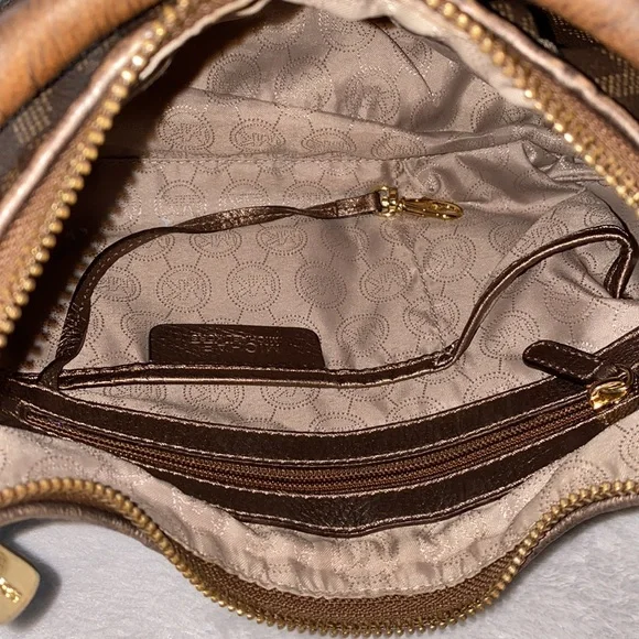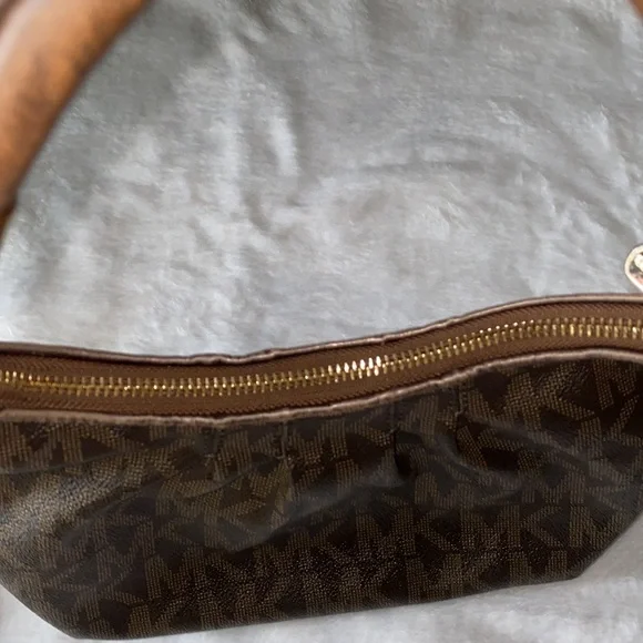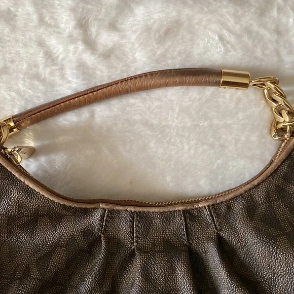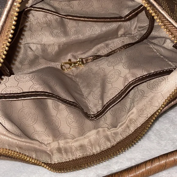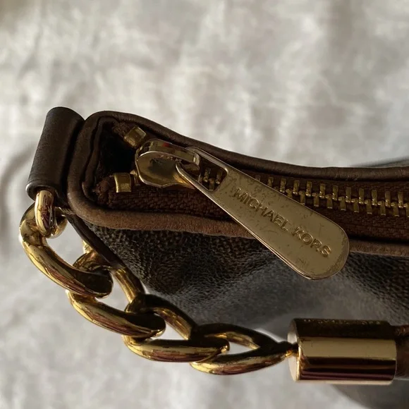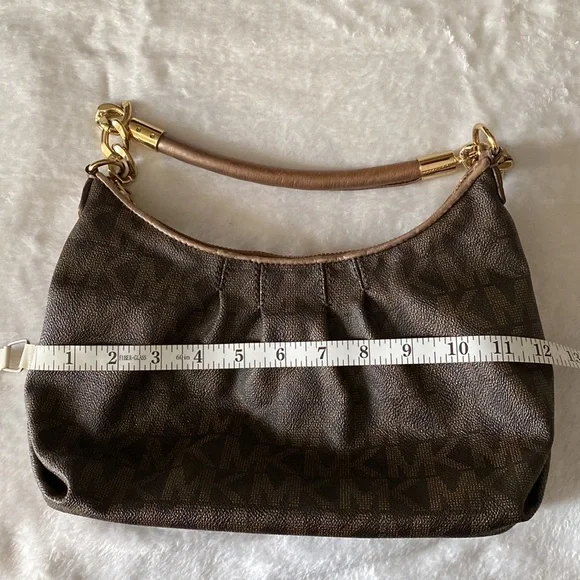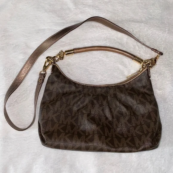 Michael Kors dark brown & gold pebbled leather medium bag with MK logo print all over; could be used either as a crossbody or shoulder bag36” removable handbag strap & 15” chain link handbag handleGold zipper closure on topInside has hook strap to attach wallet or keysBag has two open pockets & an inside zipper pocket on one side & two open pockets on the opposite side Measurements in pictures above EUC **if more pictures are needed, please ask before purchasing! Thank you 🙂