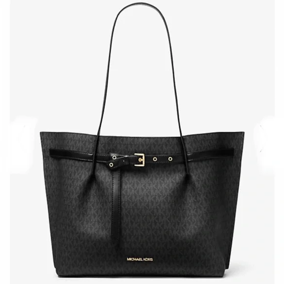 Brand new with tagColor: Black Signature DETAILS• Tote bag• Logo-print canvas• 74% coated canvas/19% polyester/7% polyurethane• Trim: 60% polyurethane/20% cotton/ 20% polyester• Silver -tone hardware• 16.75"W X 11.5" H X 8.5"D• Handle drop: 11.25"• Interior details: back zip pocket, center zip compartment, 6 slip pockets• Lining: polyester• Snap/zip fastening• ImportedOur Emilia bag delivers grab-and-go glamour.Crafted from Signature-print canvas with belted detailing, this softly structured tote is spacious enough to hold a laptop and more. It features a center zip compartment for easy organization, as well as a long top handle that makes it a comfortable choice when commuting long distance.