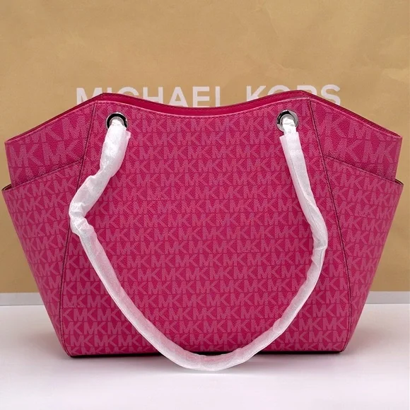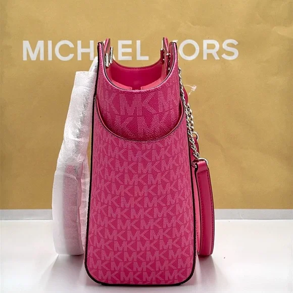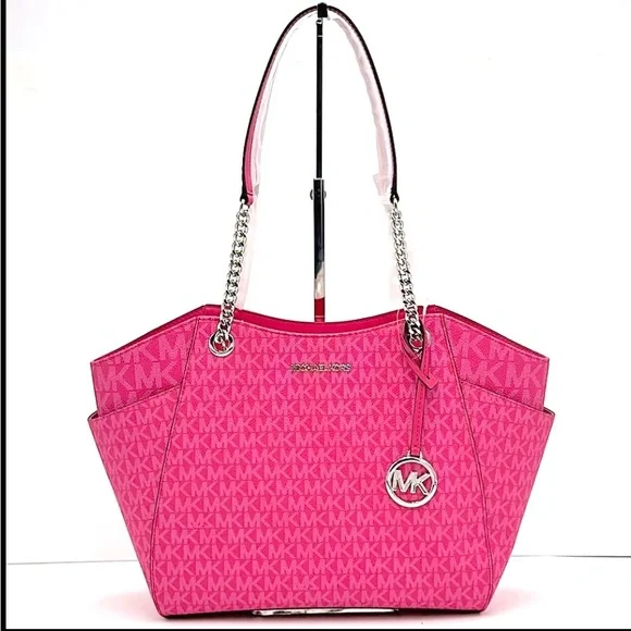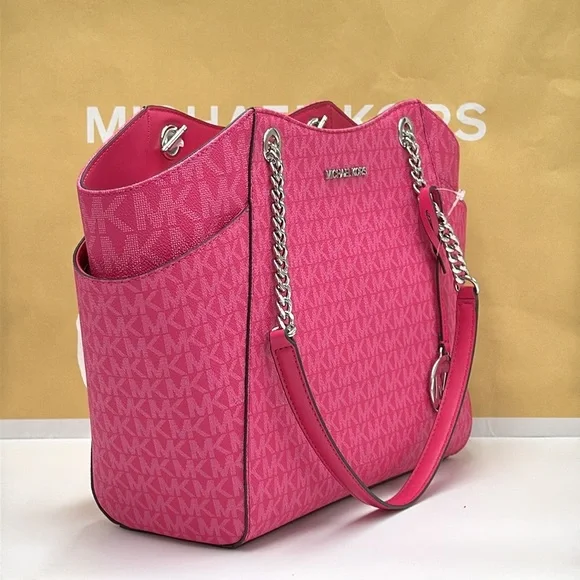 MICHAEL KORS Jet Set Travel Large Signature Chain Shoulder Tote BagDragonfruit NWT Authentic Ready to take you anywhere, this Jet Set shoulder bag is rendered in signature and finished with our signature charm. The architectural shape features convenient side pockets and a secure top-zip fastening. Use it to carry all your travel essentials.• Shoulder bag• 100% leather from tanneries meeting the highest standards of environmental performance• silver -tone hardware• 15.5"W X 9.75"H X 5.5"D• Handle drop: 10"• Exterior details: 2 side snap pockets• Interior details: back zip pocket, 2 front slip pockets• Lining: 100% polyester• Zip fastening• Dust bag not included• Imported