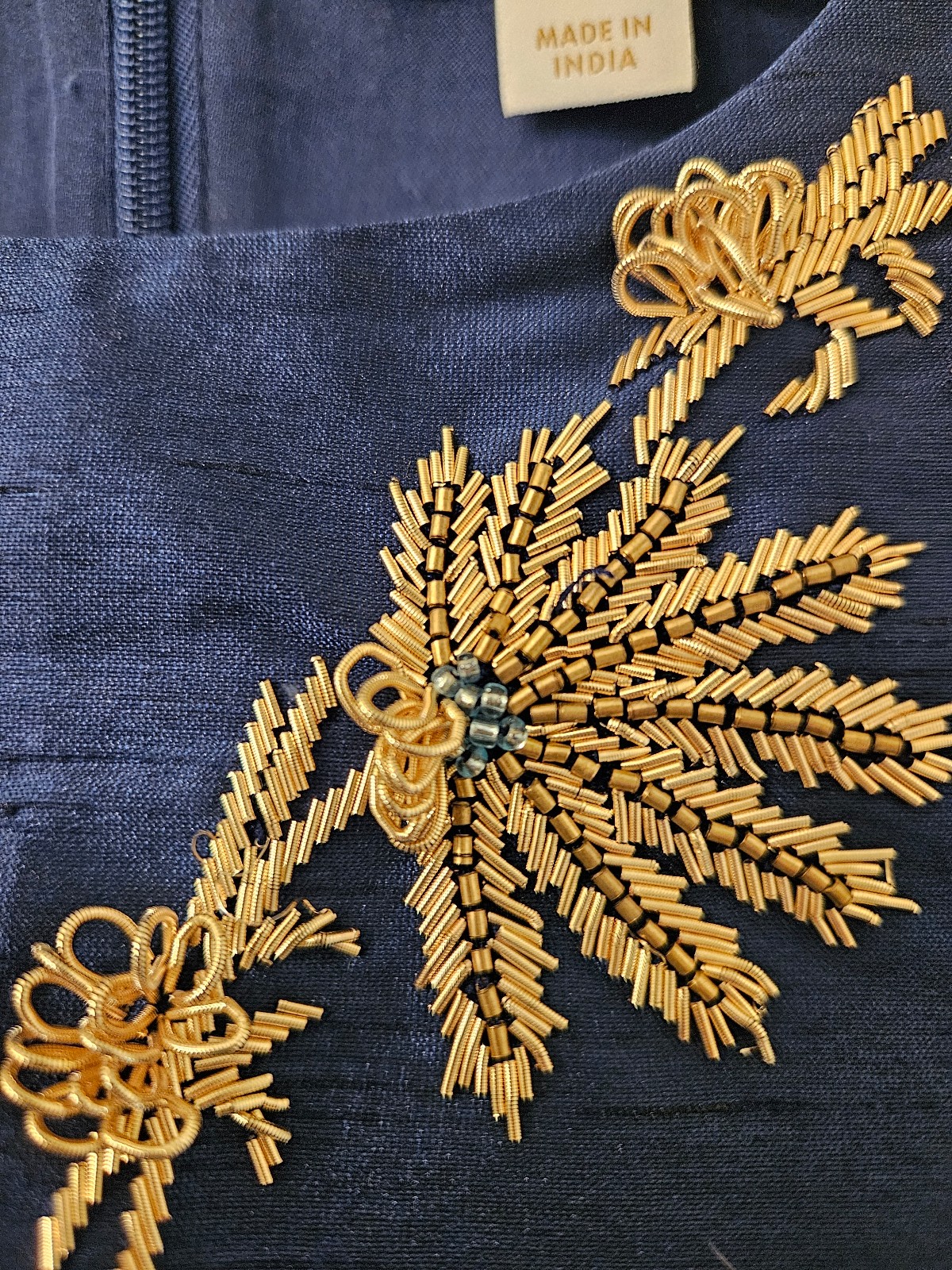 This Alice long sheath dress from Nicoblu is a fabulous dress! The color is Ink Navy with a gold leaf embellishment. It's a perfect size 4, I'm 5 feet 6 inches tall, 125 lbs, and it fits perfectly without alterations. Just like in the photos.