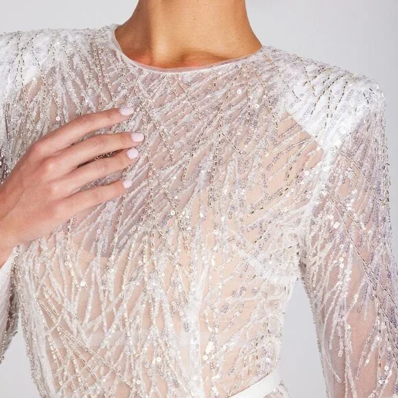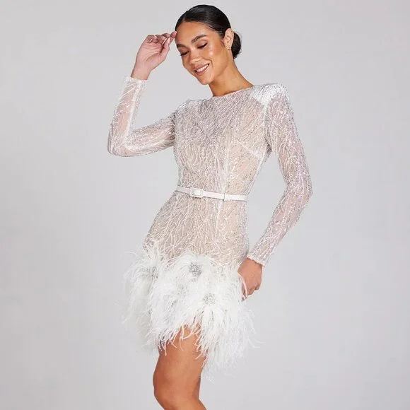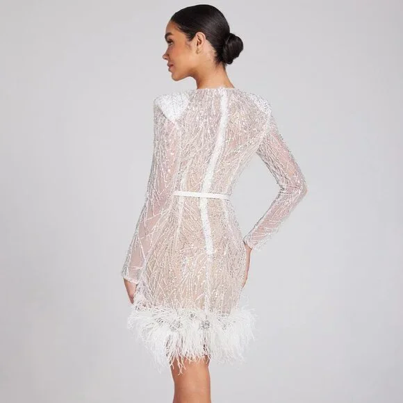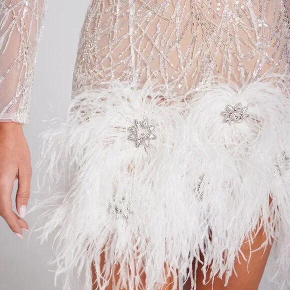 Aria White Dress - S with Curved Slip - S / Light NudeARIA is a mixed sequin, bead, and thread embroidered sheer mesh white mini dress designed to be worn with a complimentary slip dress in light or dark nude for extra coverage. Cut to a sculpting fit with shoulder pads, white feather diamanté appliqué detailing to the hem, and a white satin belt. The tonal slip dress is included and to be selected at checkout. Please choose your preferred colour lining. - Sheer mesh fabric- Mixed sequins, beads & thread embroidery- Round neckline- Shoulder pads- Detachable white satin belt- White feather diamanté appliqué detailing to the hem- Concealed zip closure- Figure-skimming fit - Detachable tonal slip to be worn underneath