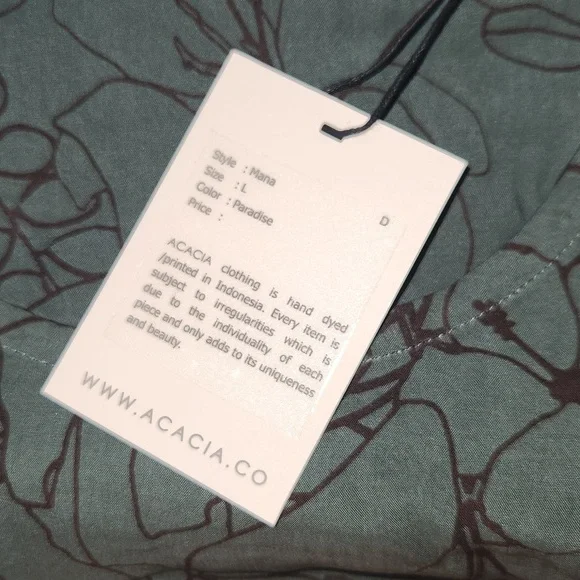 Brand new with tag & still in acacia plastic bag. Exclusive mana mini dress in paradise green & black hibiscus tropical floral hawaiian print by acacia swimwear. Large. Sold exclusively at only one retailer, society bikini. No trade please. Price is firm & reflects high% posh fees, rarity, way above retail price I paid.