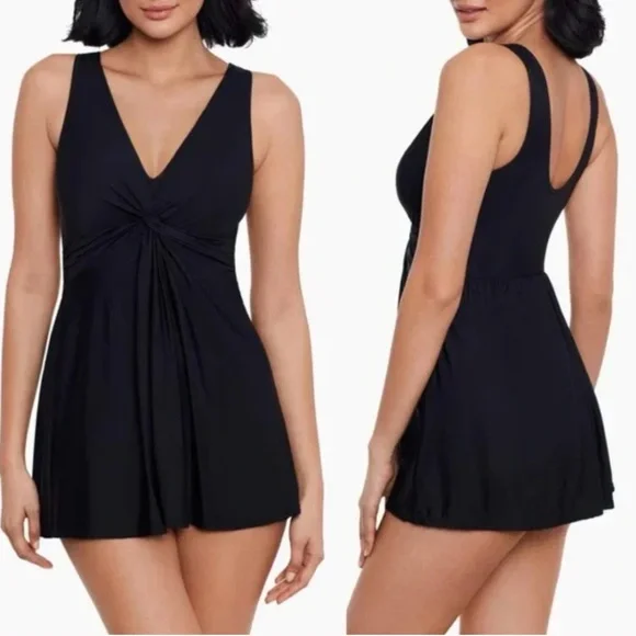 Stock photo to show fit only, please see photos for deep purple color. Beautiful new with tags Miraclesuit swim dress in a deep purple (eggplant). Size 10 with a flattering v-neck and skirt. From Miraclesuit: ACCENTUATE BUST WITH KNOT FRONT V-NECKLINE. VISUALLY SLIM TORSO WITH EMPIRE WAIST. HIGH SCOOP BACK. SWIMDRESS HIDES HIPS, REAR, AND THIGHS. SOFT MOLDED CUP BRA. 69% NYLON / 31% LYCRA SPANDEX. FOR COMPRESSION FIT, PURCHASE NORMAL SIZE. FOR COMFORT FIT, PURCHASE ONE SIZE LARGER THAN NORMAL.Questions? Leave a comment below!